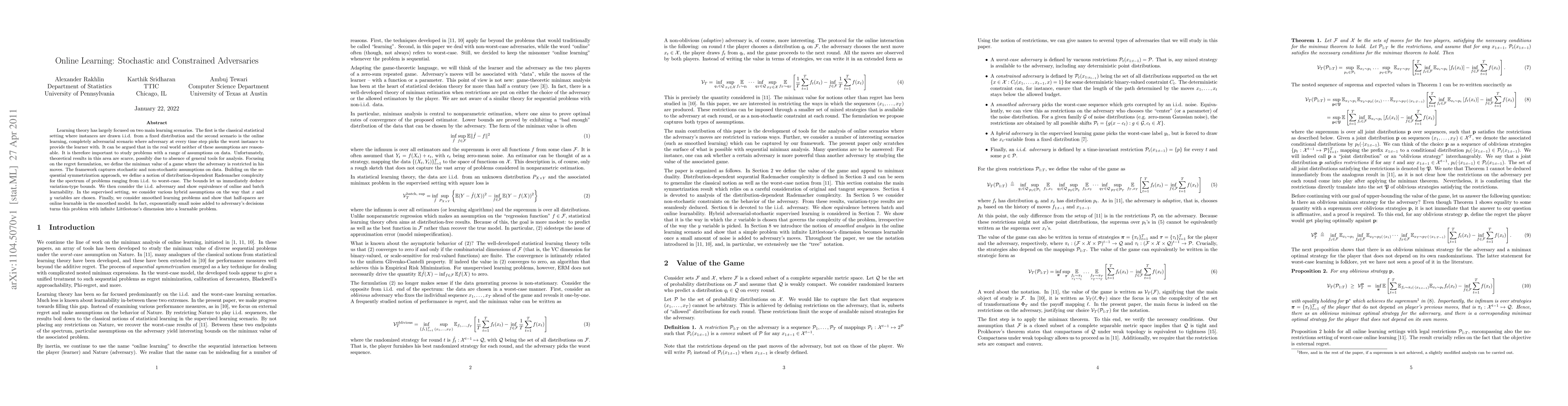 Learning theory has largely focused on two main learning scenarios. The first is the classical statistical setting where instances are drawn i.i.d. from a fixed distribution and the second scenario is the online learning, completely adversarial scenario where adversary at every time step picks the worst instance to provide the learner with. It can be argued that in the real world neither of these assumptions are reasonable. It is therefore important to study problems with a range of assumptions on data. Unfortunately, theoretical results in this area are scarce, possibly due to absence of general tools for analysis. Focusing on the regret formulation, we define the minimax value of a game where the adversary is restricted in his moves. The framework captures stochastic and non-stochastic assumptions on data. Building on the sequential symmetrization approach, we define a notion of distribution-dependent Rademacher complexity for the spectrum of problems ranging from i.i.d. to worst-case. The bounds let us immediately deduce variation-type bounds. We then consider the i.i.d. adversary and show equivalence of online and batch learnability. In the supervised setting, we consider various hybrid assumptions on the way that x and y variables are chosen. Finally, we consider smoothed learning problems and show that half-spaces are online learnable in the smoothed model. In fact, exponentially small noise added to adversary's decisions turns this problem with infinite Littlestone's dimension into a learnable problem.