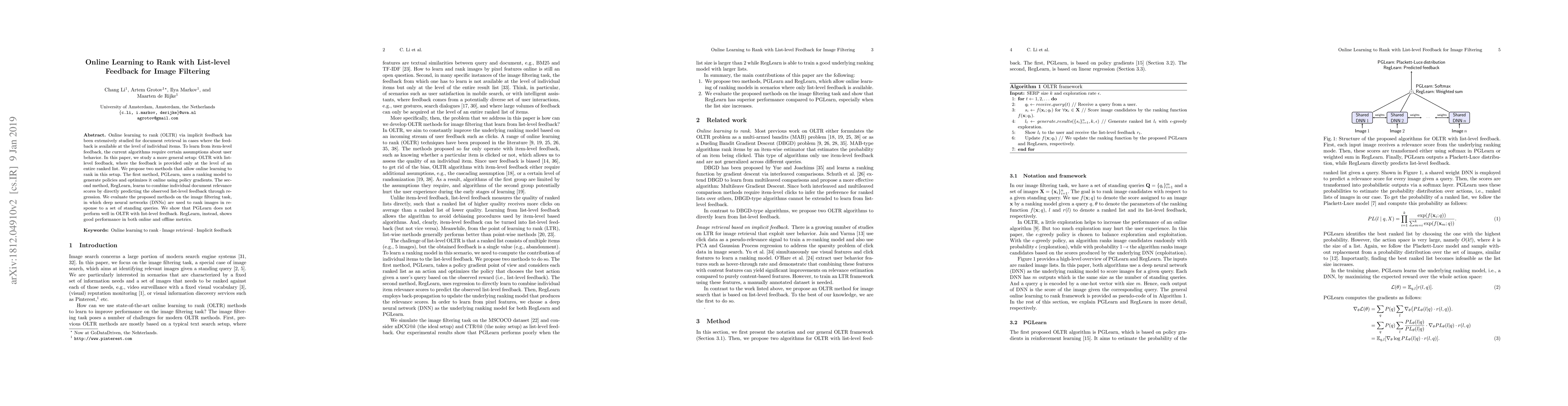 This paper proposes two online learning to rank methods for image filtering using list-level feedback. The first method, PGLearn, uses policy gradients but performs poorly. The second method, RegLearn, directly predicts list-level feedback through regression and shows better performance in both online and offline metrics.
