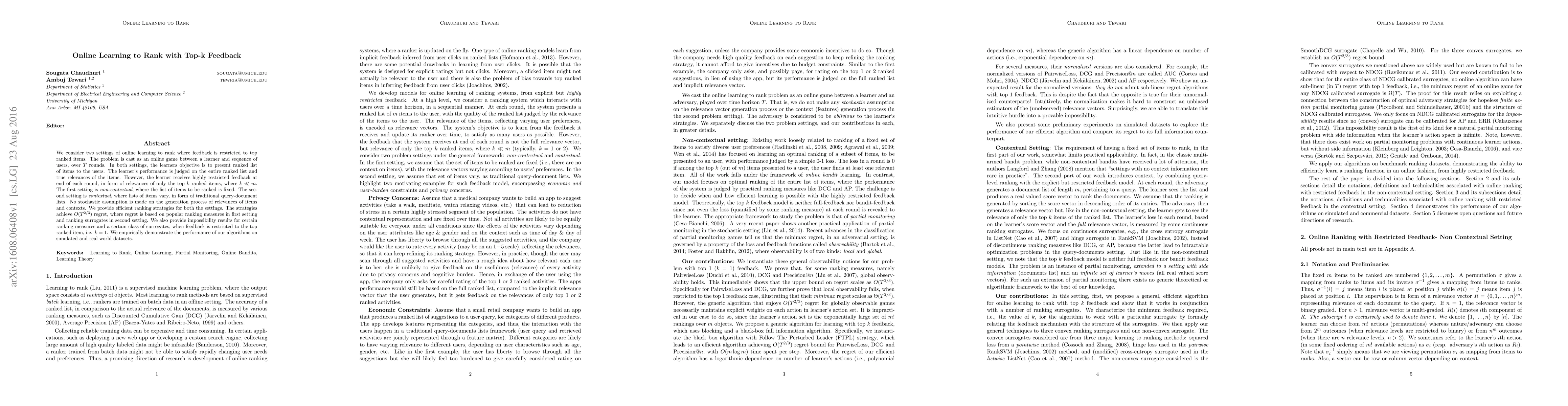 We consider two settings of online learning to rank where feedback is restricted to top ranked items. The problem is cast as an online game between a learner and sequence of users, over $T$ rounds. In both settings, the learners objective is to present ranked list of items to the users. The learner's performance is judged on the entire ranked list and true relevances of the items. However, the learner receives highly restricted feedback at end of each round, in form of relevances of only the top $k$ ranked items, where $k \ll m$. The first setting is \emph{non-contextual}, where the list of items to be ranked is fixed. The second setting is \emph{contextual}, where lists of items vary, in form of traditional query-document lists. No stochastic assumption is made on the generation process of relevances of items and contexts. We provide efficient ranking strategies for both the settings. The strategies achieve $O(T^{2/3})$ regret, where regret is based on popular ranking measures in first setting and ranking surrogates in second setting. We also provide impossibility results for certain ranking measures and a certain class of surrogates, when feedback is restricted to the top ranked item, i.e. $k=1$. We empirically demonstrate the performance of our algorithms on simulated and real world datasets.