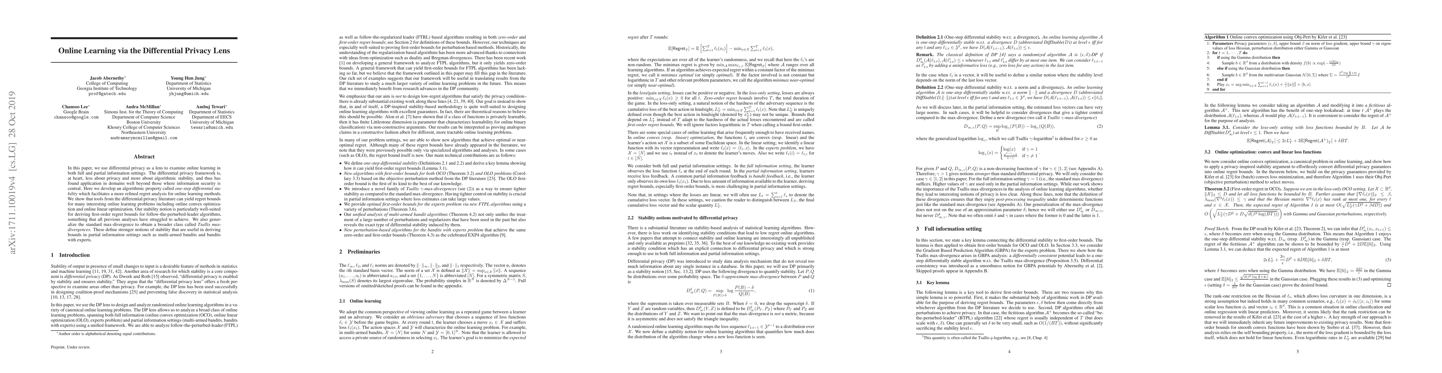 In this paper, we use differential privacy as a lens to examine online learning in both full and partial information settings. The differential privacy framework is, at heart, less about privacy and more about algorithmic stability, and thus has found application in domains well beyond those where information security is central. Here we develop an algorithmic property called one-step differential stability which facilitates a more refined regret analysis for online learning methods. We show that tools from the differential privacy literature can yield regret bounds for many interesting online learning problems including online convex optimization and online linear optimization. Our stability notion is particularly well-suited for deriving first-order regret bounds for follow-the-perturbed-leader algorithms, something that all previous analyses have struggled to achieve. We also generalize the standard max-divergence to obtain a broader class called Tsallis max-divergences. These define stronger notions of stability that are useful in deriving bounds in partial information settings such as multi-armed bandits and bandits with experts.