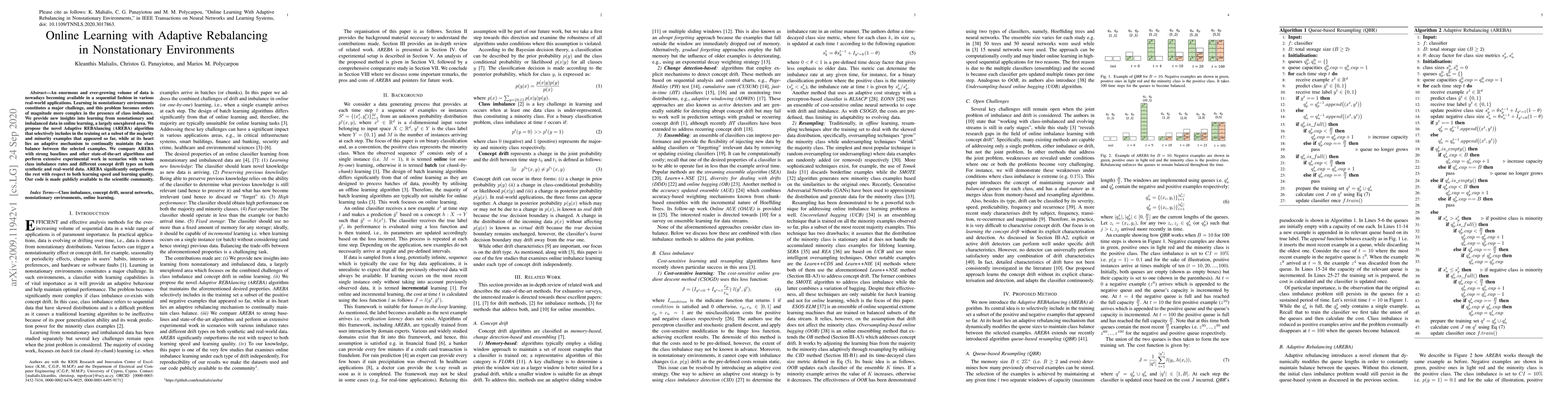 This paper introduces the Adaptive REBAlancing (AREBA) algorithm for online learning in nonstationary environments with class imbalance. AREBA selectively balances the training set by adaptively including subsets of majority and minority examples, significantly outperforming other methods in both learning speed and quality.