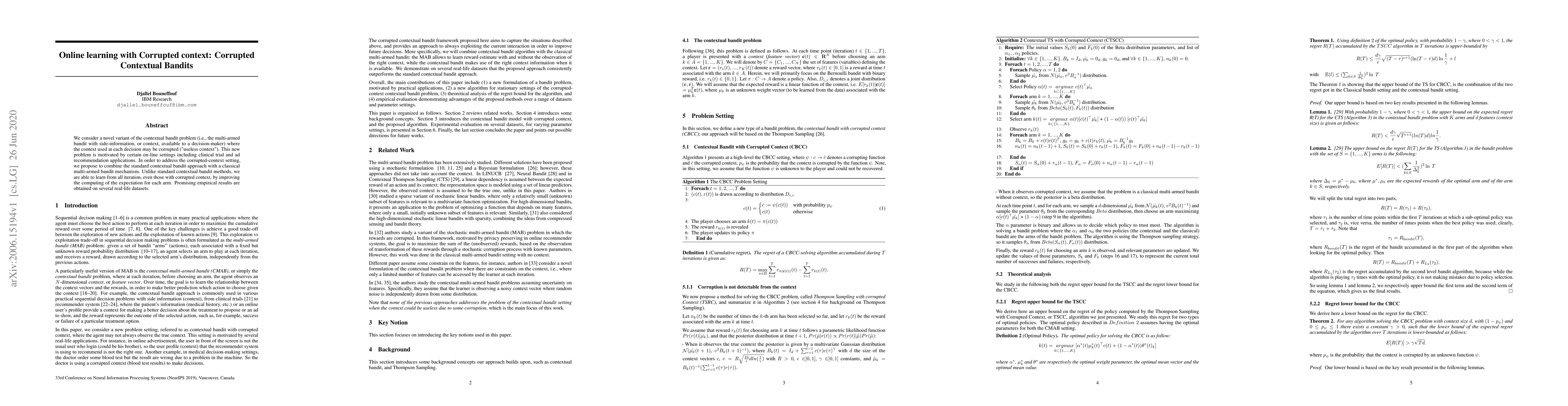 This paper introduces a novel variant of the contextual bandit problem where context information may be corrupted, proposing a hybrid approach combining standard contextual bandits with a multi-armed bandit mechanism to learn from all iterations. Empirical results show promising performance on real-life datasets.