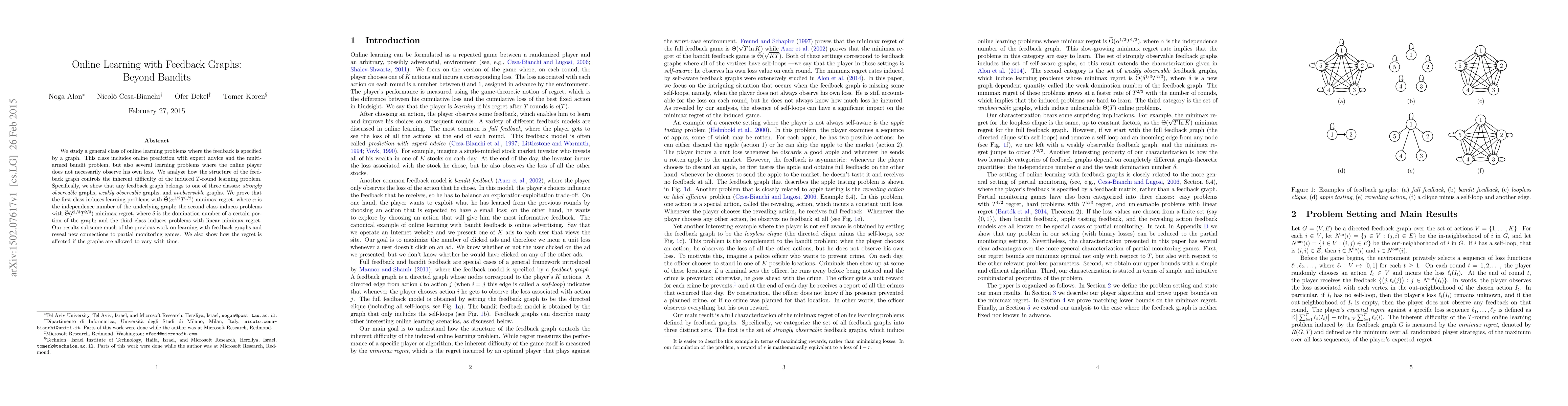 This paper explores online learning problems with feedback specified by a graph, categorizing them into strongly, weakly, and unobservable graphs based on their structure. It establishes minimax regret bounds for each class, revealing new insights into the impact of graph properties on learning difficulty.