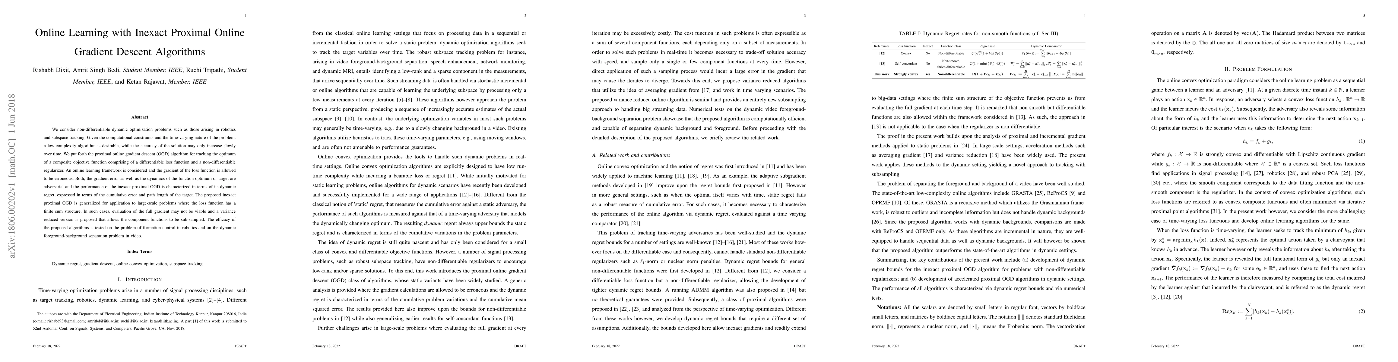 We consider non-differentiable dynamic optimization problems such as those arising in robotics and subspace tracking. Given the computational constraints and the time-varying nature of the problem, a low-complexity algorithm is desirable, while the accuracy of the solution may only increase slowly over time. We put forth the proximal online gradient descent (OGD) algorithm for tracking the optimum of a composite objective function comprising of a differentiable loss function and a non-differentiable regularizer. An online learning framework is considered and the gradient of the loss function is allowed to be erroneous. Both, the gradient error as well as the dynamics of the function optimum or target are adversarial and the performance of the inexact proximal OGD is characterized in terms of its dynamic regret, expressed in terms of the cumulative error and path length of the target. The proposed inexact proximal OGD is generalized for application to large-scale problems where the loss function has a finite sum structure. In such cases, evaluation of the full gradient may not be viable and a variance reduced version is proposed that allows the component functions to be sub-sampled. The efficacy of the proposed algorithms is tested on the problem of formation control in robotics and on the dynamic foreground-background separation problem in video.