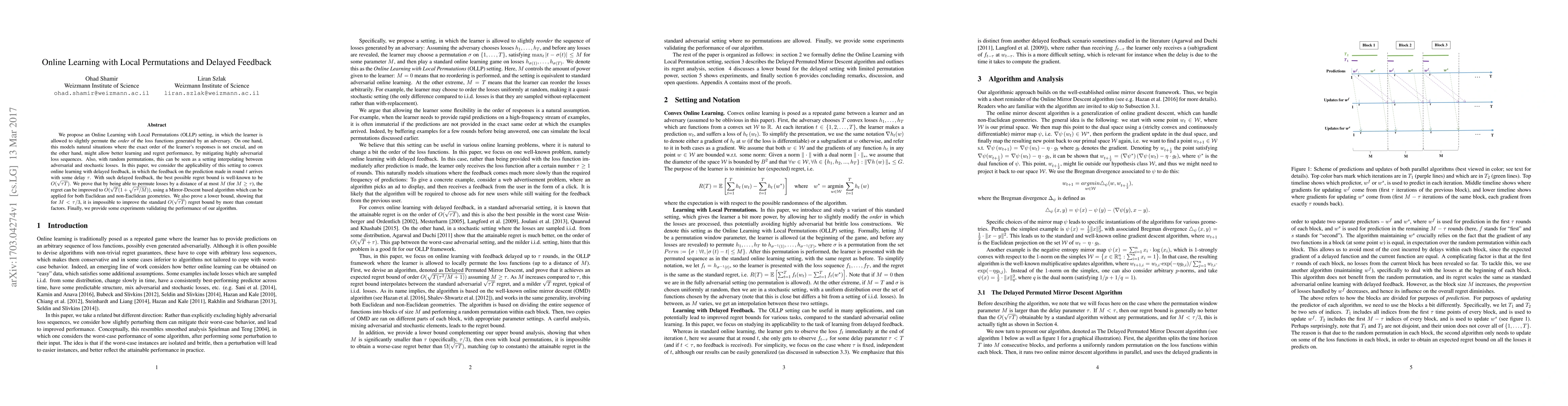 This paper introduces the Online Learning with Local Permutations (OLLP) setting, where learners can permute loss function orders to improve learning performance. It demonstrates that permuting losses within a distance of $M$ (where $M \geq \tau$) can reduce regret to $O(\sqrt{T}(1+\sqrt{\tau^2/M}))$ in convex online learning with delayed feedback, outperforming the standard $O(\sqrt{\tau T})$ bound.