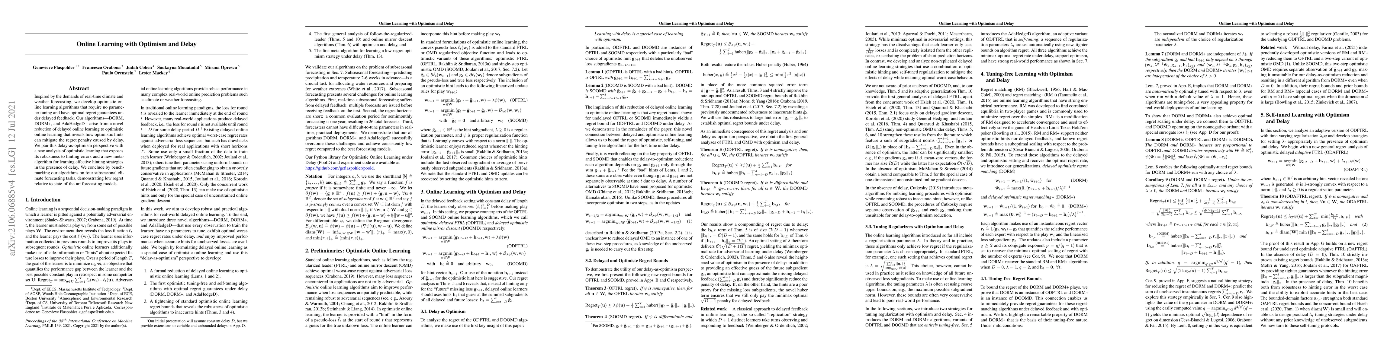 Researchers developed optimistic online learning algorithms that require no parameter tuning and have optimal regret guarantees under delayed feedback, outperforming state-of-the-art forecasting models in subseasonal climate forecasting tasks.