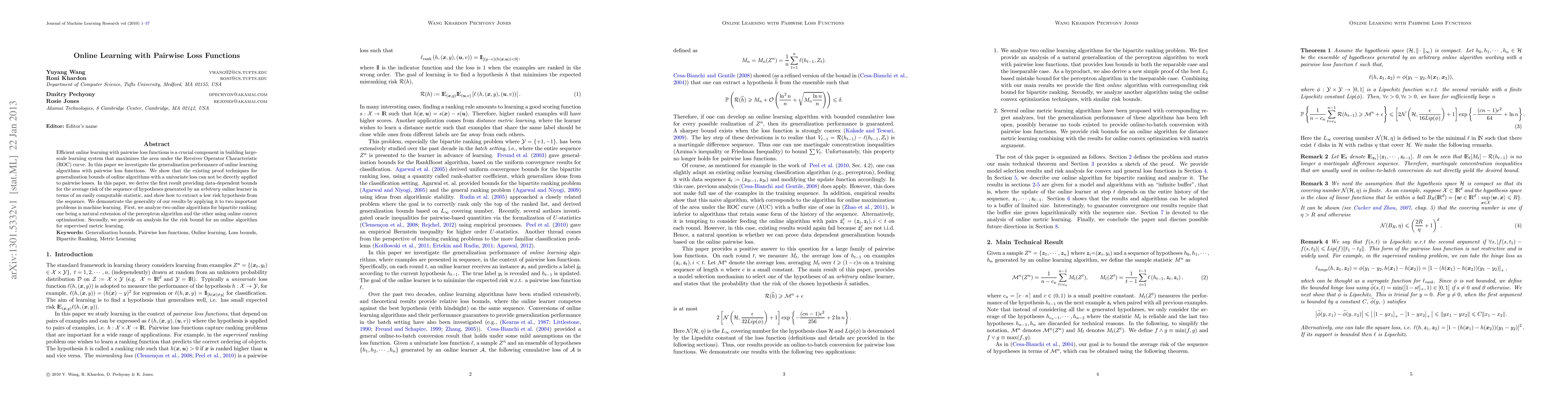 This paper investigates the generalization performance of online learning algorithms using pairwise loss functions, deriving new data-dependent bounds for average risk and demonstrating their application to bipartite ranking and supervised metric learning. The study highlights the limitations of existing proof techniques for univariate loss and introduces a novel approach to extract low-risk hypotheses.