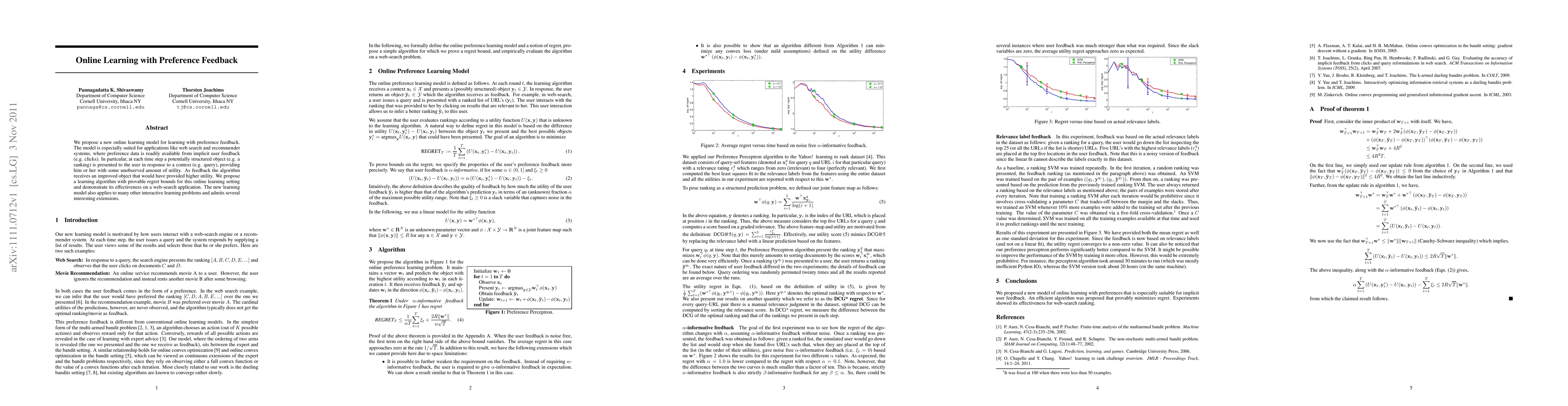 This paper introduces a novel online learning model that leverages preference feedback, particularly useful for web search and recommender systems. The proposed algorithm achieves provable regret bounds and demonstrates effectiveness in a web-search application, with potential for broader application in interactive learning scenarios.