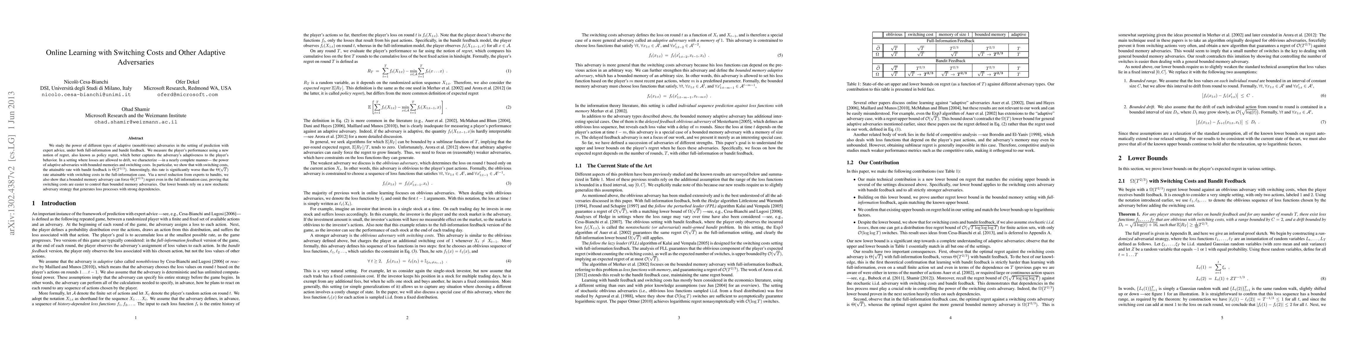 This paper investigates adaptive adversaries in online learning, comparing performance under full-information and bandit feedback. It introduces a new regret measure and shows that while switching costs improve performance under full-information, they significantly degrade performance under bandit feedback, achieving a $\widetilde{\Theta}(T^{2/3})$ rate.