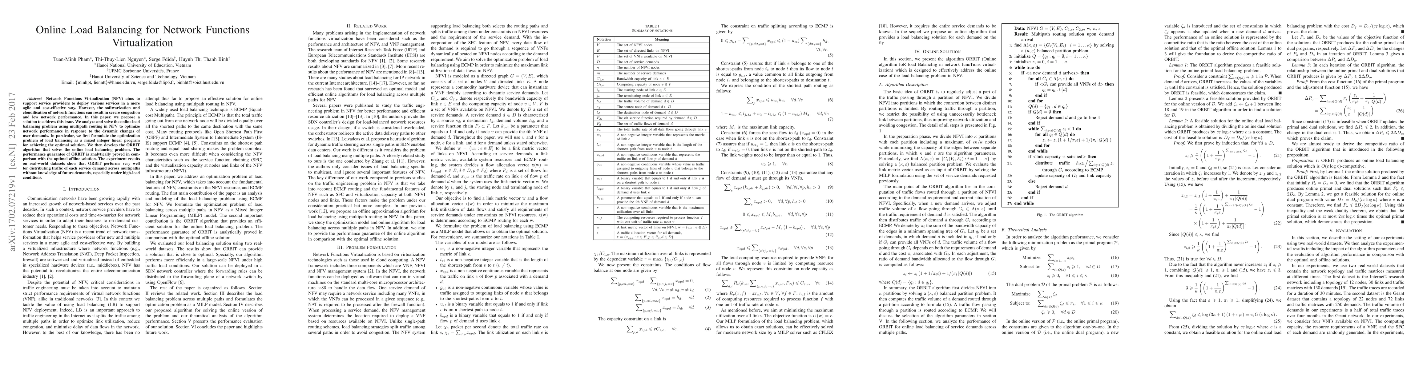 This paper proposes an ORBIT algorithm for online load balancing in Network Functions Virtualization (NFV) to optimize network performance amid dynamic user demands. The algorithm uses multipath routing and is proven to perform well under high-load conditions, as demonstrated by experiments on real-world datasets.
