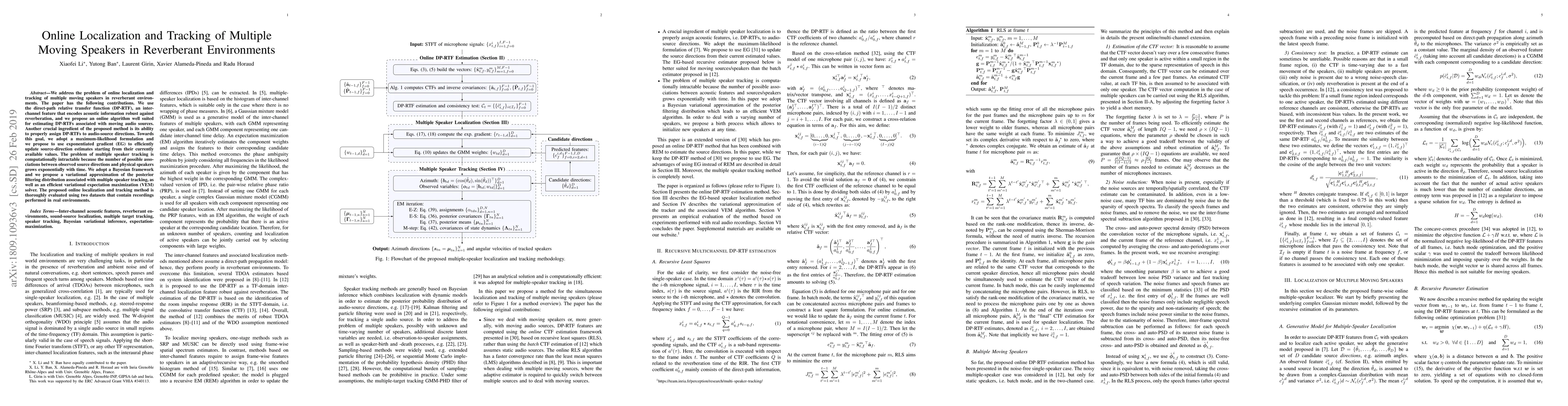 This paper proposes an online algorithm for localizing and tracking multiple moving speakers in reverberant environments using the direct-path relative transfer function (DP-RTF) and an efficient exponentiated gradient approach for source-direction estimation. The method employs a Bayesian framework with a variational expectation-maximization solver to manage the computational complexity of multiple speaker tracking.