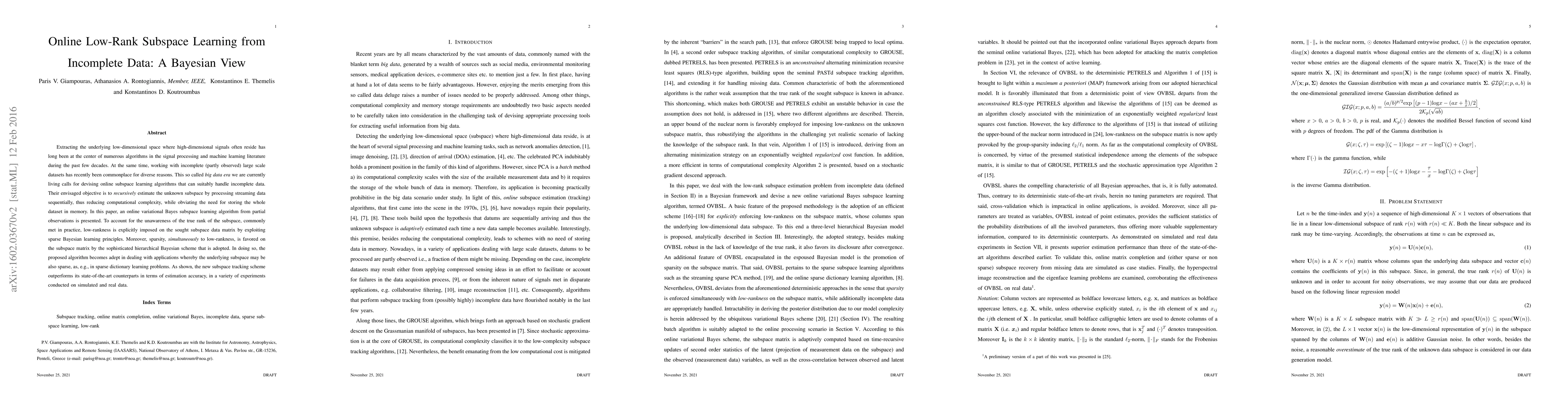 This paper proposes an online variational Bayes subspace learning algorithm to recursively estimate low-rank subspaces from incomplete data, leveraging sparse Bayesian learning principles and a hierarchical Bayesian scheme to handle both low-rank and sparse matrices, achieving superior estimation accuracy over existing methods.