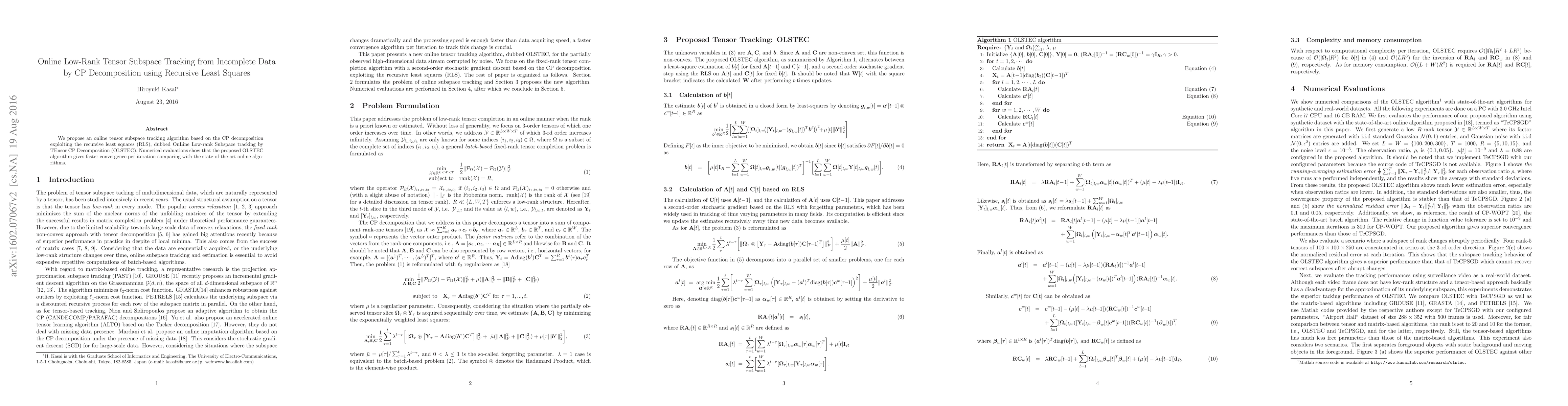 The paper introduces OLSTEC, an online tensor subspace tracking algorithm utilizing CP decomposition and recursive least squares, which demonstrates faster convergence than existing methods. Numerical evaluations confirm the superior performance of OLSTEC in handling incomplete data.
