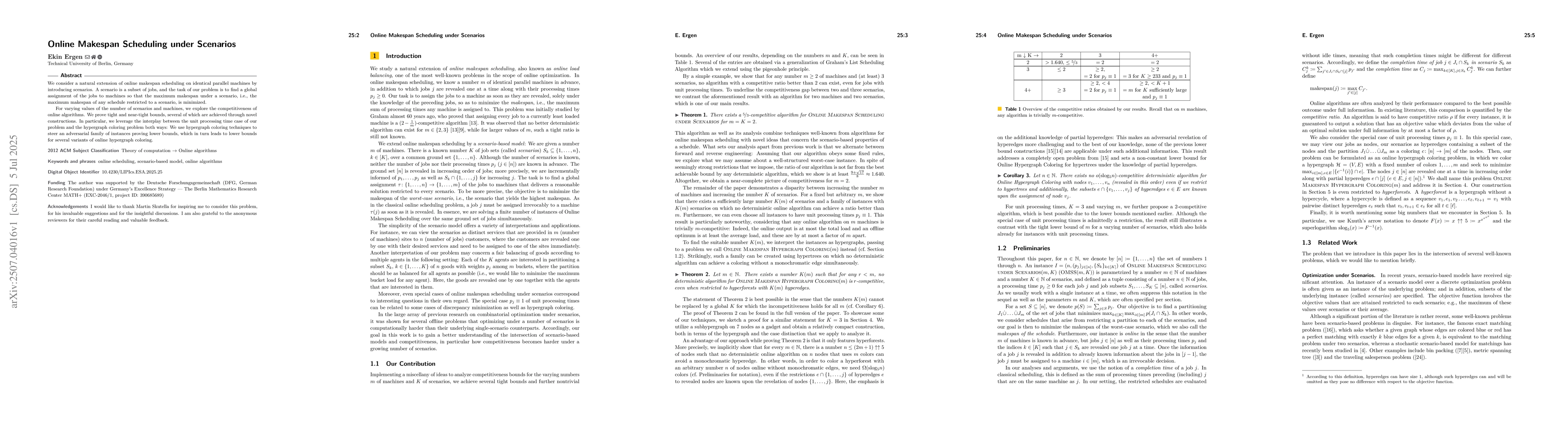We consider a natural extension of online makespan scheduling on identical parallel machines by introducing scenarios. A scenario is a subset of jobs, and the task of our problem is to find a global assignment of the jobs to machines so that the maximum makespan under a scenario, i.e., the maximum makespan of any schedule restricted to a scenario, is minimized. For varying values of the number of scenarios and machines, we explore the competitiveness of online algorithms. We prove tight and near-tight bounds, several of which are achieved through novel constructions. In particular, we leverage the interplay between the unit processing time case of our problem and the hypergraph coloring problem both ways: We use hypergraph coloring techniques to steer an adversarial family of instances proving lower bounds, which in turn leads to lower bounds for several variants of online hypergraph coloring.