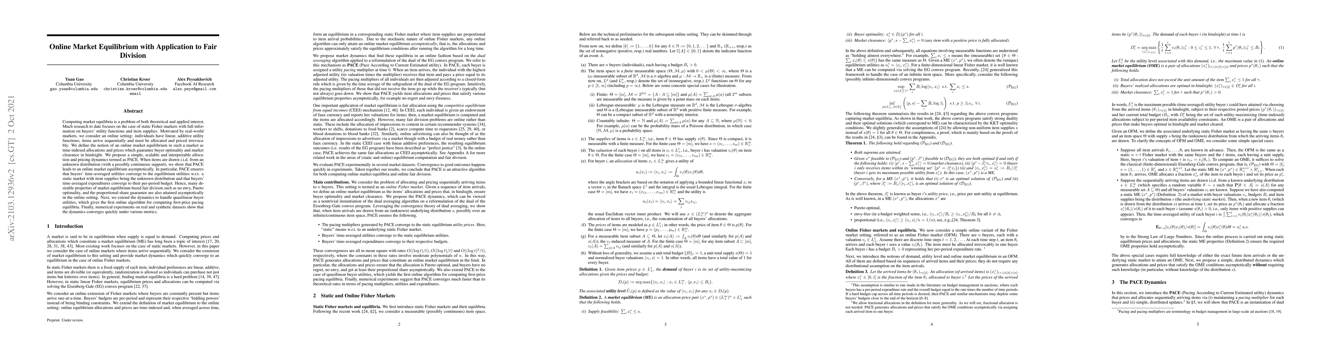 This paper introduces an online market equilibrium concept for fair division in dynamic settings where items arrive sequentially. The proposed PACE algorithm achieves asymptotic convergence to equilibrium utilities and expenditures, ensuring properties like no envy and Pareto optimality. The method is extended to quasilinear utilities, providing the first online algorithm for first-price pacing equilibria, with numerical experiments demonstrating its quick convergence.