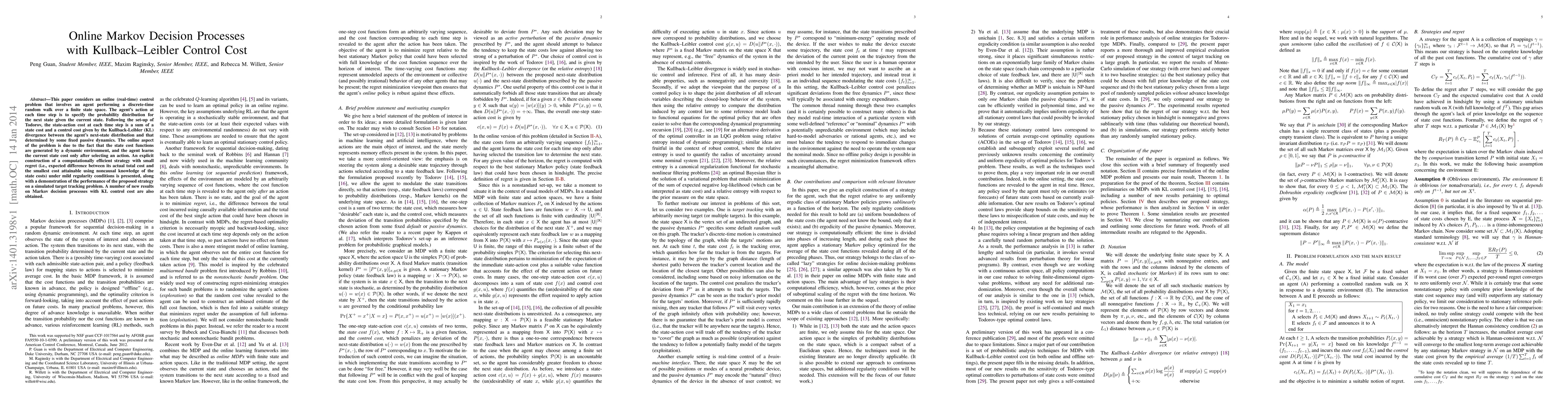 This paper proposes an online control strategy for a Markov decision process with Kullback-Leibler control cost, achieving small regret under mild conditions. The strategy is demonstrated through a simulated target tracking problem, alongside new results on Markov decision processes with KL control cost.