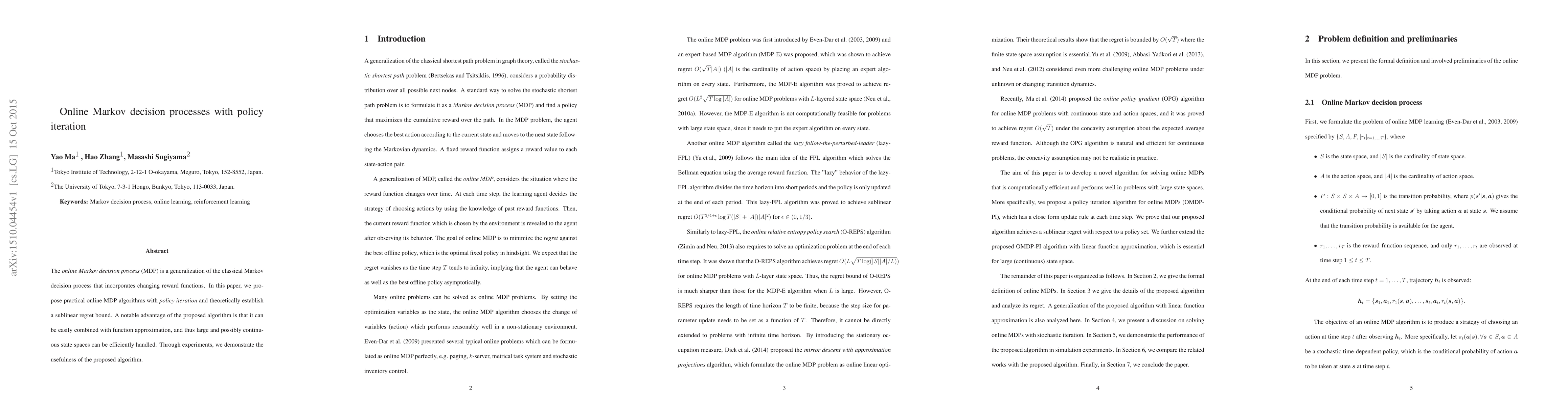 This paper proposes practical online Markov decision process algorithms with policy iteration, achieving a sublinear regret bound. It effectively handles large and continuous state spaces through function approximation and demonstrates its utility through experiments.