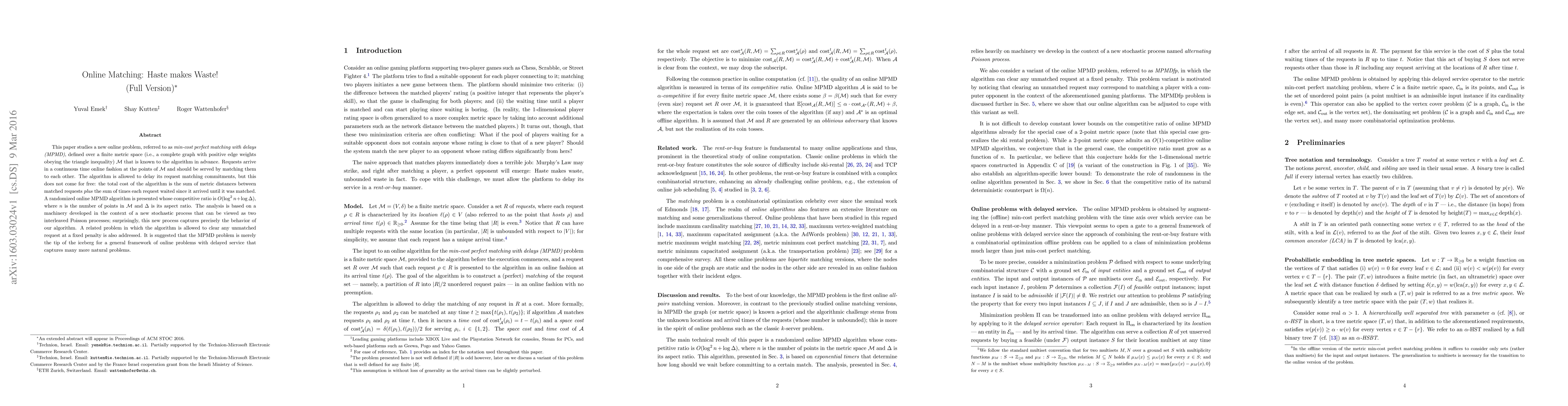 This paper studies a new online problem, referred to as \emph{min-cost perfect matching with delays (MPMD)}, defined over a finite metric space (i.e., a complete graph with positive edge weights obeying the triangle inequality) $\mathcal{M}$ that is known to the algorithm in advance. Requests arrive in a continuous time online fashion at the points of $\mathcal{M}$ and should be served by matching them to each other. The algorithm is allowed to delay its request matching commitments, but this does not come for free: the total cost of the algorithm is the sum of metric distances between matched requests \emph{plus} the sum of times each request waited since it arrived until it was matched. A randomized online MPMD algorithm is presented whose competitive ratio is $O (\log^{2} n + \log \Delta)$, where $n$ is the number of points in $\mathcal{M}$ and $\Delta$ is its aspect ratio. The analysis is based on a machinery developed in the context of a new stochastic process that can be viewed as two interleaved Poisson processes; surprisingly, this new process captures precisely the behavior of our algorithm. A related problem in which the algorithm is allowed to clear any unmatched request at a fixed penalty is also addressed. It is suggested that the MPMD problem is merely the tip of the iceberg for a general framework of online problems with delayed service that captures many more natural problems.