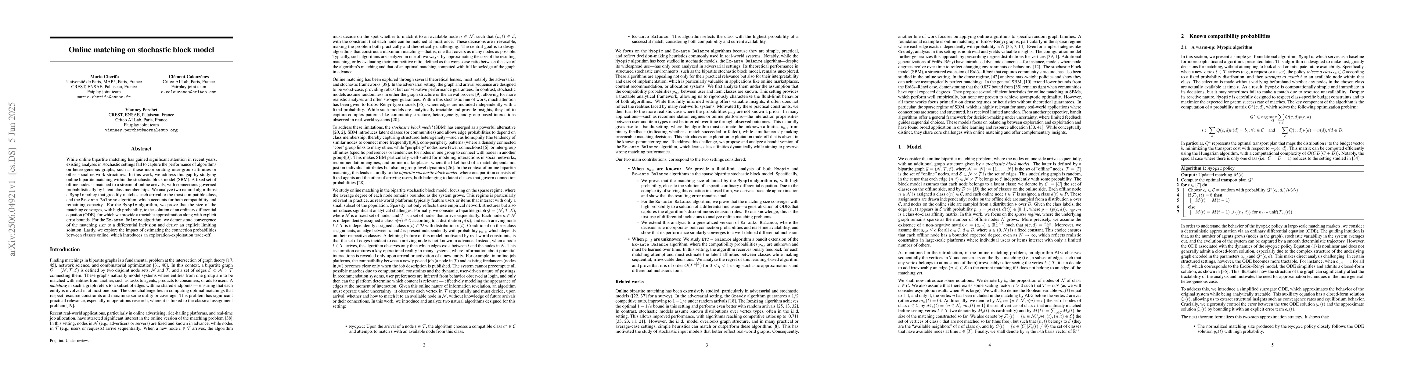 While online bipartite matching has gained significant attention in recent years, existing analyses in stochastic settings fail to capture the performance of algorithms on heterogeneous graphs, such as those incorporating inter-group affinities or other social network structures. In this work, we address this gap by studying online bipartite matching within the stochastic block model (SBM). A fixed set of offline nodes is matched to a stream of online arrivals, with connections governed probabilistically by latent class memberships. We analyze two natural algorithms: a $\tt{Myopic}$ policy that greedily matches each arrival to the most compatible class, and the $\tt{Balance}$ algorithm, which accounts for both compatibility and remaining capacity. For the $\tt{Myopic}$ algorithm, we prove that the size of the matching converges, with high probability, to the solution of an ordinary differential equation (ODE), for which we provide a tractable approximation along with explicit error bounds. For the $\tt{Balance}$ algorithm, we demonstrate convergence of the matching size to a differential inclusion and derive an explicit limiting solution. Lastly, we explore the impact of estimating the connection probabilities between classes online, which introduces an exploration-exploitation trade-off.