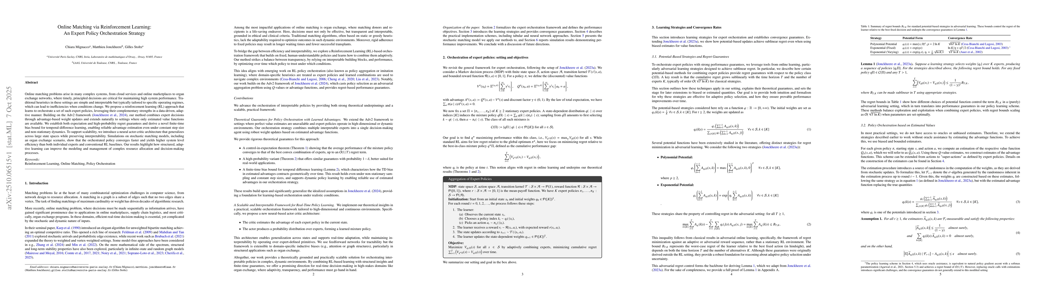 Online matching problems arise in many complex systems, from cloud services and online marketplaces to organ exchange networks, where timely, principled decisions are critical for maintaining high system performance. Traditional heuristics in these settings are simple and interpretable but typically tailored to specific operating regimes, which can lead to inefficiencies when conditions change. We propose a reinforcement learning (RL) approach that learns to orchestrate a set of such expert policies, leveraging their complementary strengths in a data-driven, adaptive manner. Building on the Adv2 framework (Jonckheere et al., 2024), our method combines expert decisions through advantage-based weight updates and extends naturally to settings where only estimated value functions are available. We establish both expectation and high-probability regret guarantees and derive a novel finite-time bias bound for temporal-difference learning, enabling reliable advantage estimation even under constant step size and non-stationary dynamics. To support scalability, we introduce a neural actor-critic architecture that generalizes across large state spaces while preserving interpretability. Simulations on stochastic matching models, including an organ exchange scenario, show that the orchestrated policy converges faster and yields higher system level efficiency than both individual experts and conventional RL baselines. Our results highlight how structured, adaptive learning can improve the modeling and management of complex resource allocation and decision-making processes.