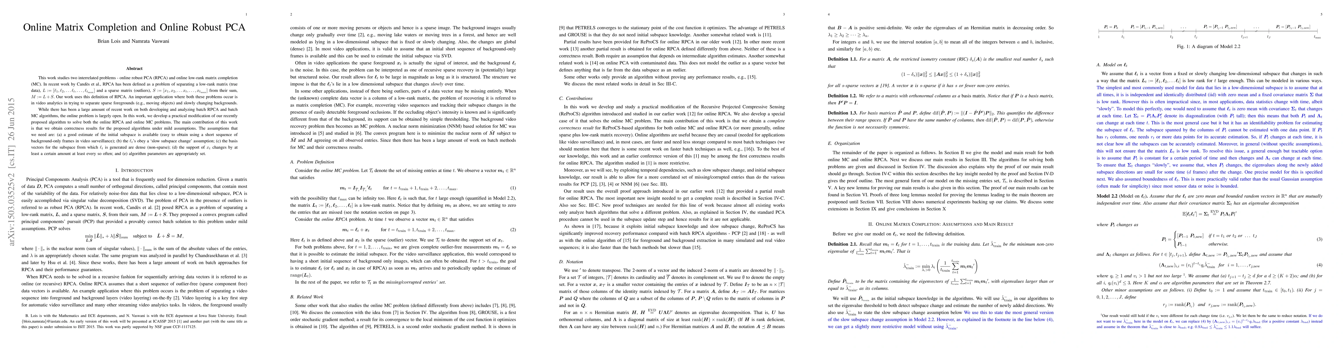This paper develops online algorithms for robust PCA (RPCA) and low-rank matrix completion (MC), addressing their application in video analytics. It provides correctness results under assumptions including a good initial subspace estimate and slow subspace changes, with practical modifications to existing batch algorithms.