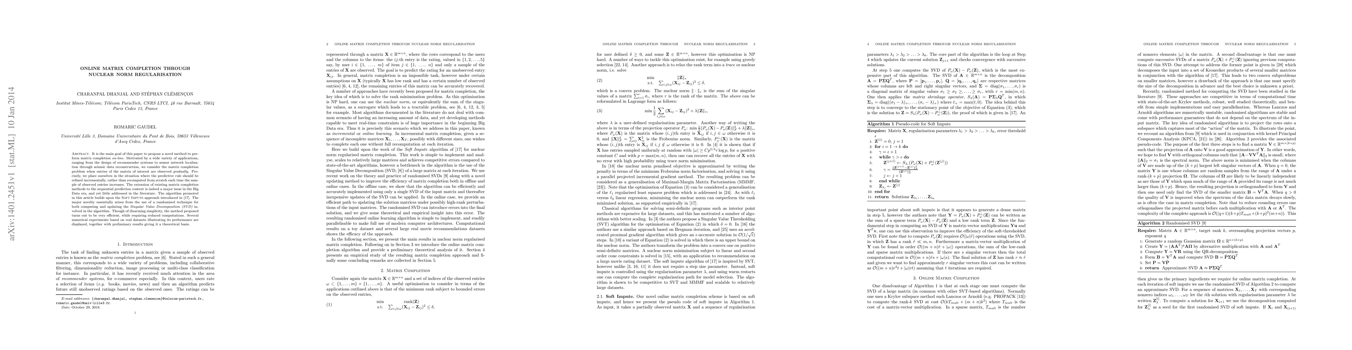 It is the main goal of this paper to propose a novel method to perform matrix completion on-line. Motivated by a wide variety of applications, ranging from the design of recommender systems to sensor network localization through seismic data reconstruction, we consider the matrix completion problem when entries of the matrix of interest are observed gradually. Precisely, we place ourselves in the situation where the predictive rule should be refined incrementally, rather than recomputed from scratch each time the sample of observed entries increases. The extension of existing matrix completion methods to the sequential prediction context is indeed a major issue in the Big Data era, and yet little addressed in the literature. The algorithm promoted in this article builds upon the Soft Impute approach introduced in Mazumder et al. (2010). The major novelty essentially arises from the use of a randomised technique for both computing and updating the Singular Value Decomposition (SVD) involved in the algorithm. Though of disarming simplicity, the method proposed turns out to be very efficient, while requiring reduced computations. Several numerical experiments based on real datasets illustrating its performance are displayed, together with preliminary results giving it a theoretical basis.