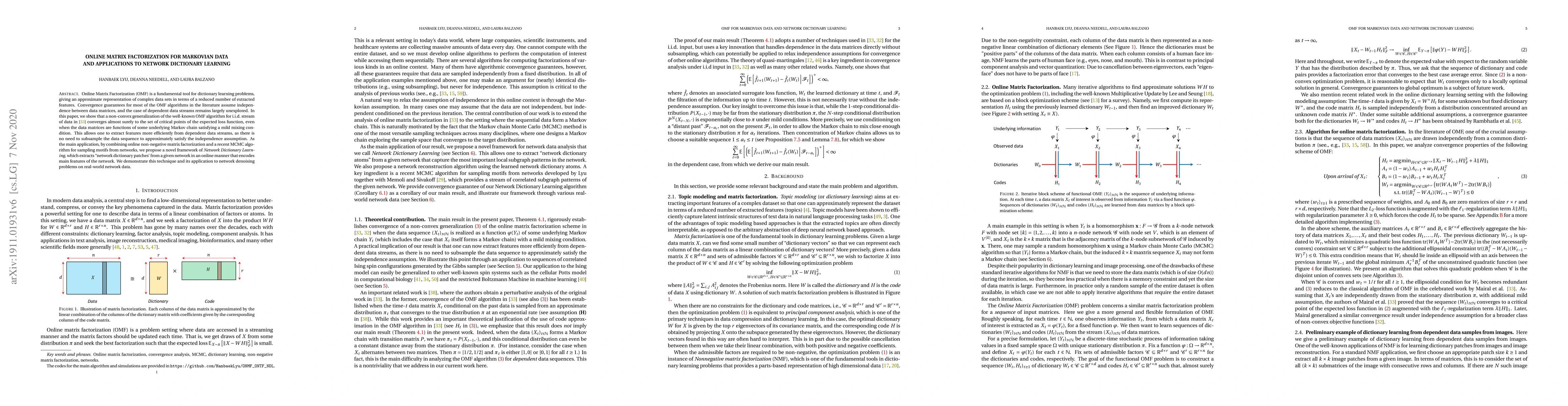 This paper presents an online matrix factorization method for dependent Markovian data streams, proving its convergence to critical points of the loss function. It applies this technique to Network Dictionary Learning, extracting meaningful features from networks in an online fashion, and demonstrates its effectiveness in network denoising.