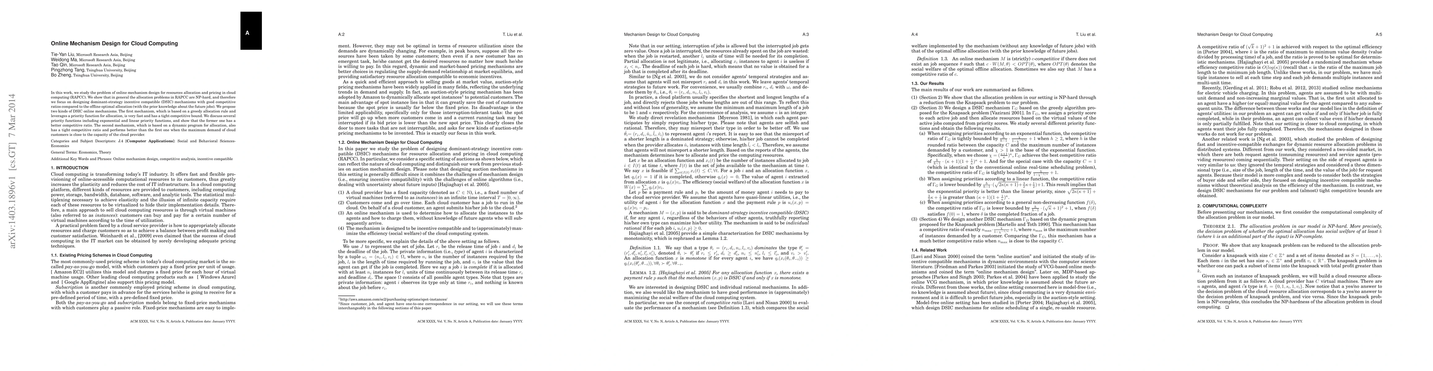 Researchers designed online mechanisms for efficient resource allocation and pricing in cloud computing, showing that some methods can achieve competitive ratios similar to optimal offline solutions.