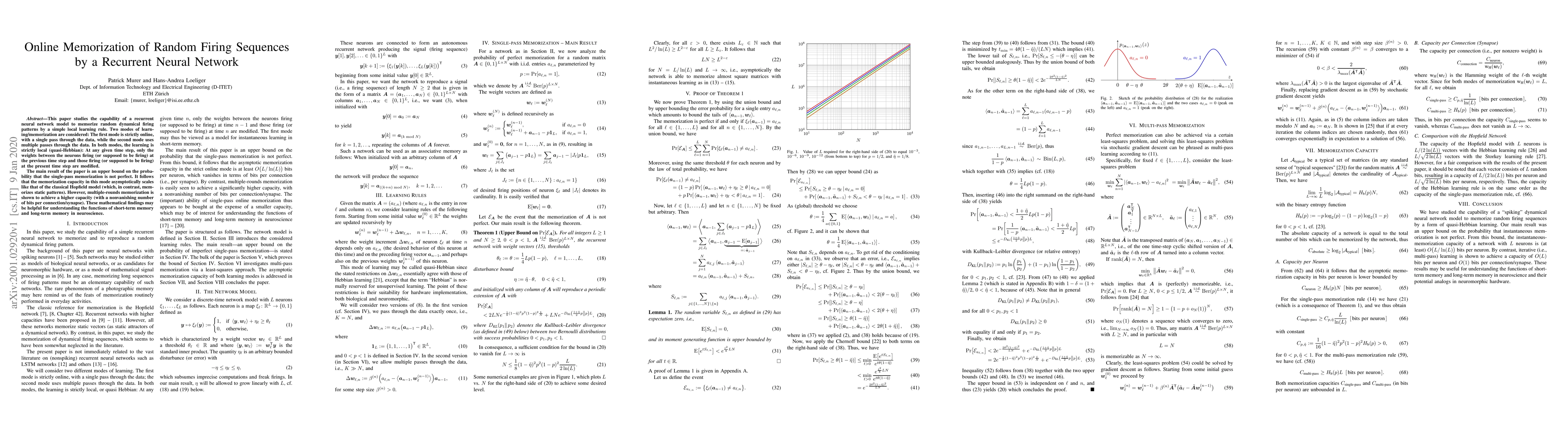 A recurrent neural network model can memorize random firing patterns using a simple local learning rule, achieving a capacity similar to the classical Hopfield model but with improved performance via multiple passes.