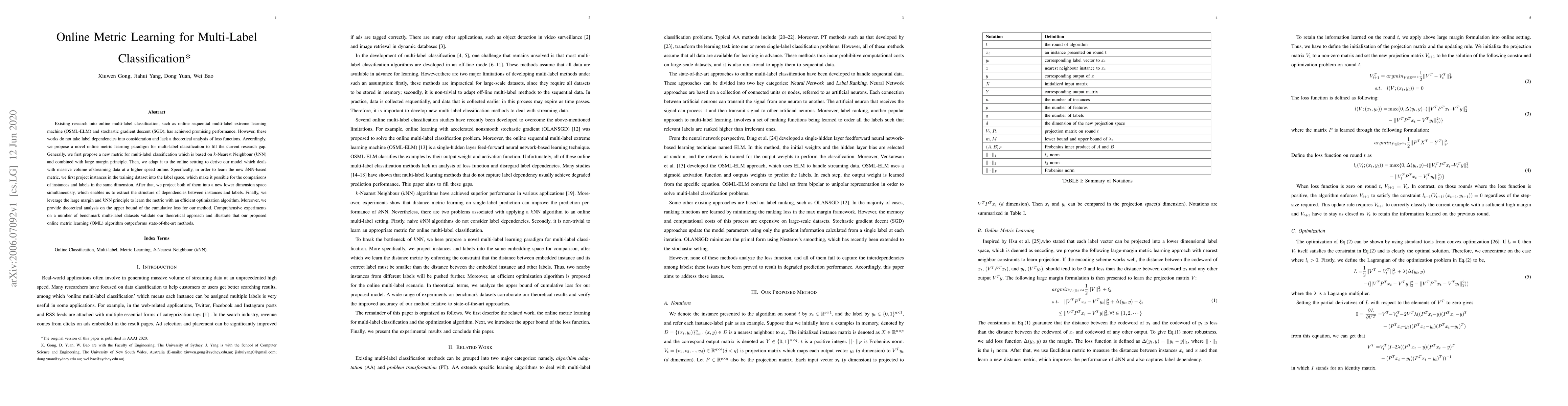 This paper proposes a novel online metric learning paradigm for multi-label classification that considers label dependencies and provides a theoretical analysis of loss functions. The method projects instances and labels into a lower dimension to extract dependency structures and leverages a large margin principle with $k$-Nearest Neighbour ($k$NN) for efficient optimization, outperforming existing methods in experiments.