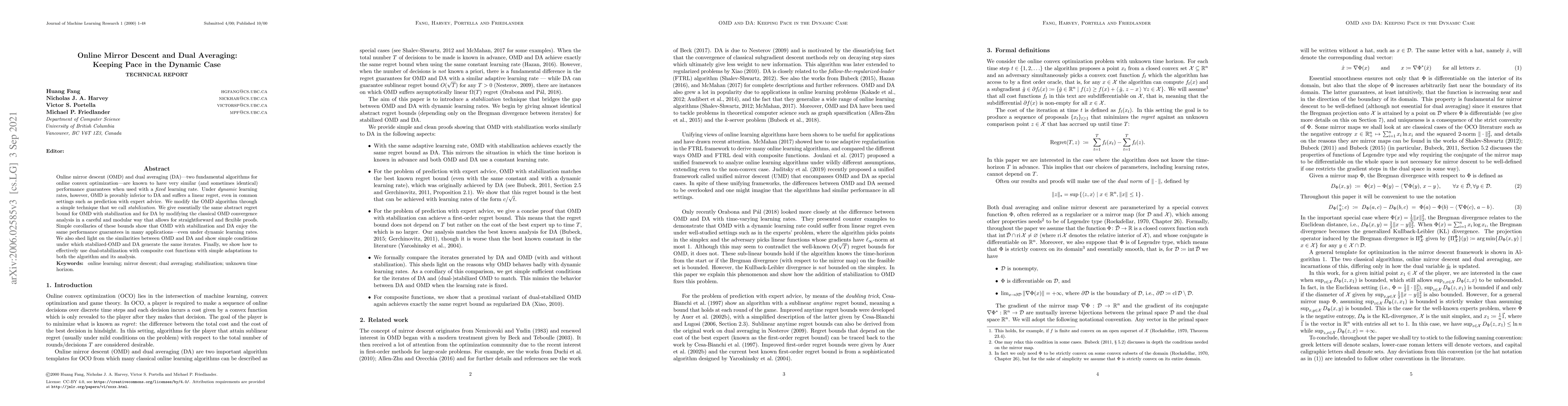 This paper modifies online mirror descent (OMD) with a technique called stabilization to match the performance of dual averaging (DA) under dynamic learning rates. It provides similar regret bounds for stabilized OMD and DA, demonstrating their equivalence in many applications even when learning rates change.