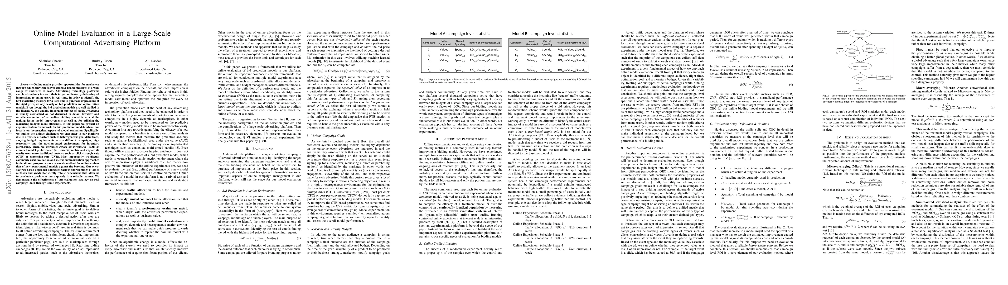 This paper presents an experimentation framework for evaluating bid prediction models in a large-scale computational advertising platform, emphasizing practical challenges like heterogeneous goals, budget variations, and seasonality. It proposes a return on investment (ROI) metric over traditional metrics for better performance evaluation and introduces a meta-analysis-based approach for more reliable and quicker model comparisons against baselines.