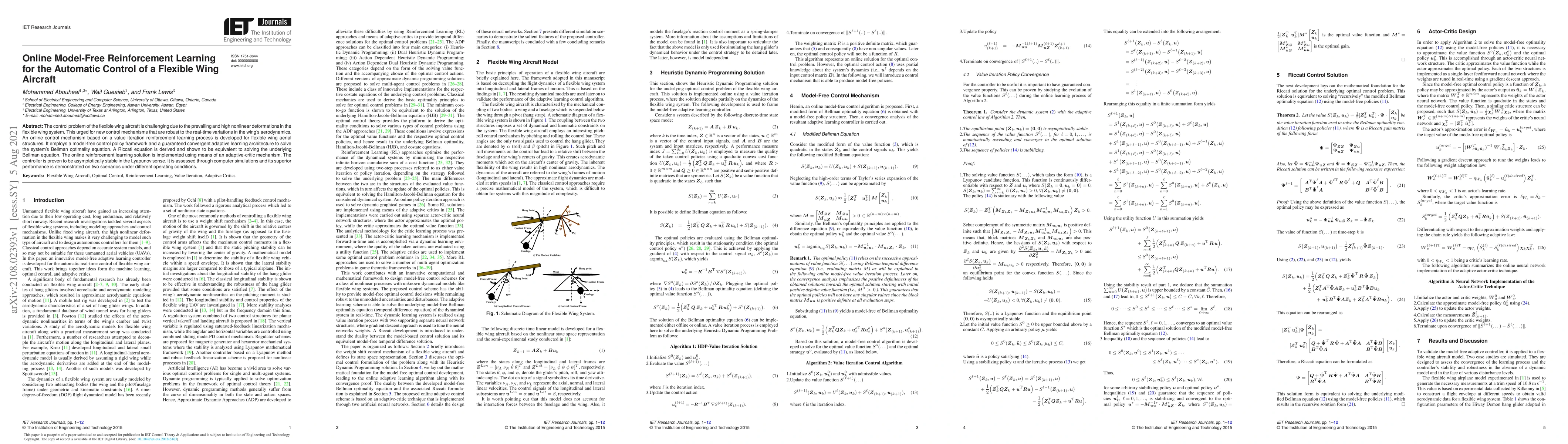 This paper develops an online model-free reinforcement learning control mechanism for flexible wing aircraft, employing a value iteration process and adaptive learning to solve the Bellman optimality equation. The proposed controller is proven to be asymptotically stable and demonstrated to outperform traditional methods in computer simulations.