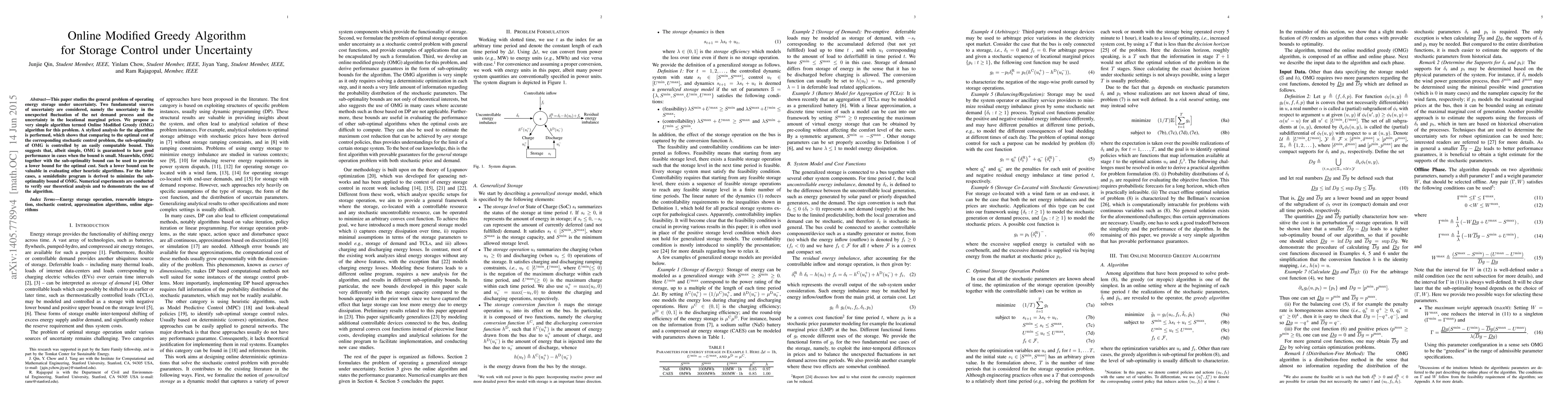 This paper studies the general problem of operating energy storage under uncertainty. Two fundamental sources of uncertainty are considered, namely the uncertainty in the unexpected fluctuation of the net demand process and the uncertainty in the locational marginal prices. We propose a very simple algorithm termed Online Modified Greedy (OMG) algorithm for this problem. A stylized analysis for the algorithm is performed, which shows that comparing to the optimal cost of the corresponding stochastic control problem, the sub-optimality of OMG is bounded and approaches zero in various scenarios. This suggests that, albeit simple, OMG is guaranteed to have good performance in some cases; and in other cases, OMG together with the sub-optimality bound can be used to provide a lower bound for the optimal cost. Such a lower bound can be valuable in evaluating other heuristic algorithms. For the latter cases, a semidefinite program is derived to minimize the sub-optimality bound of OMG. Numerical experiments are conducted to verify our theoretical analysis and to demonstrate the use of the algorithm.