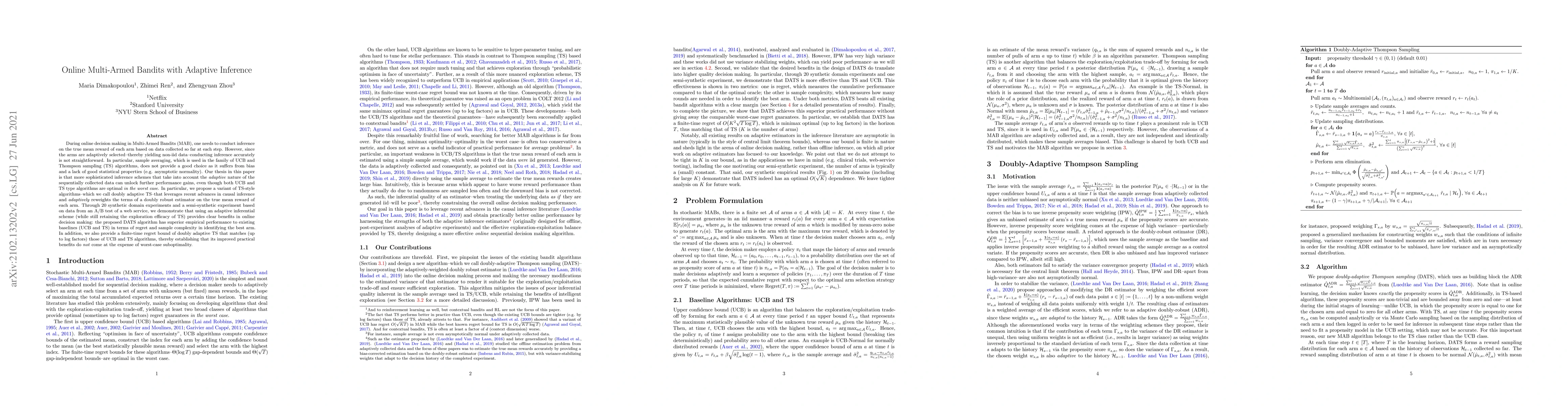 This paper proposes a doubly adaptive Thompson sampling (DATS) algorithm for online Multi-Armed Bandits (MAB) that uses advanced inference techniques to handle adaptively selected non-iid data. The DATS algorithm outperforms existing methods like UCB and TS in terms of regret and sample complexity, while maintaining comparable worst-case performance.