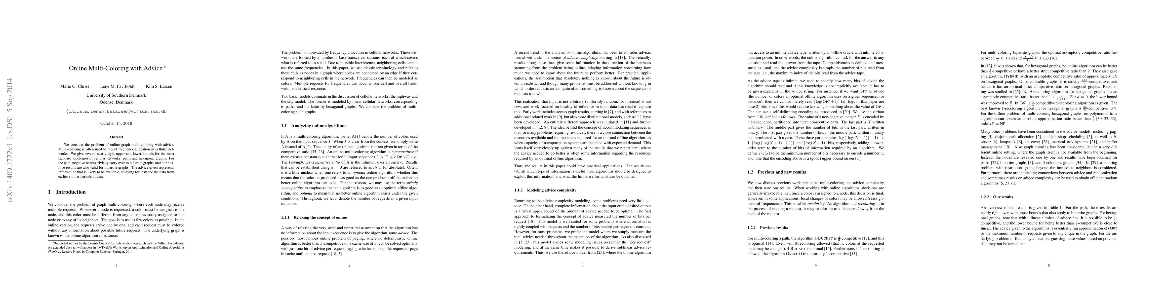 This research paper establishes nearly tight upper and lower bounds for online graph multi-coloring with advice in various network topologies, including paths and hexagonal graphs, providing valuable insights into frequency allocation in cellular networks.