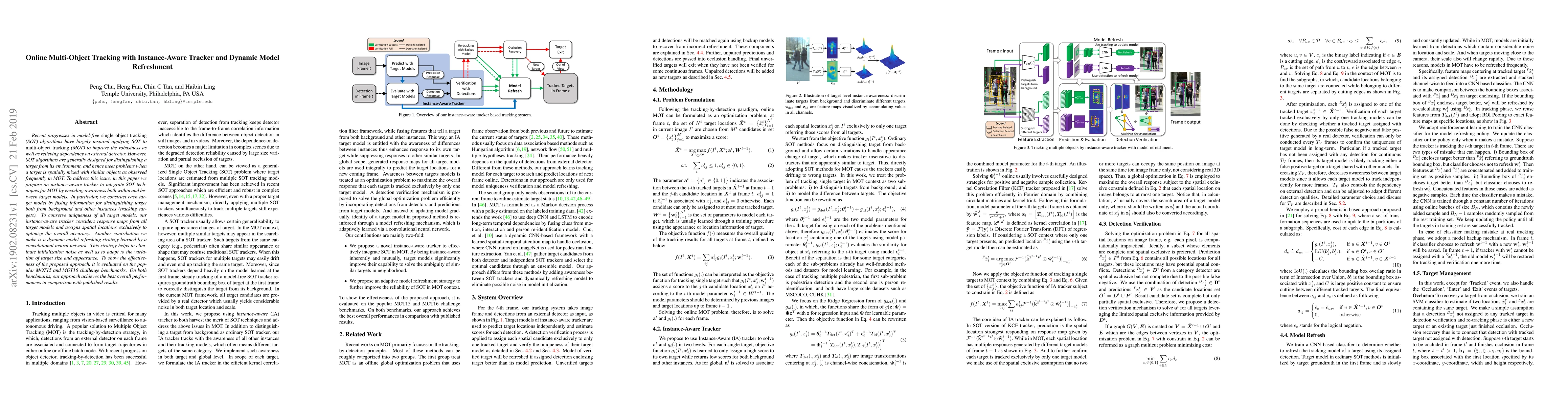 This paper proposes an instance-aware tracker for online multi-object tracking that integrates single object tracking techniques by distinguishing targets from both the background and other instances. It also introduces a dynamic model refreshment strategy to adapt to target size and appearance variations, achieving superior performance on MOT15 and MOT16 benchmarks.