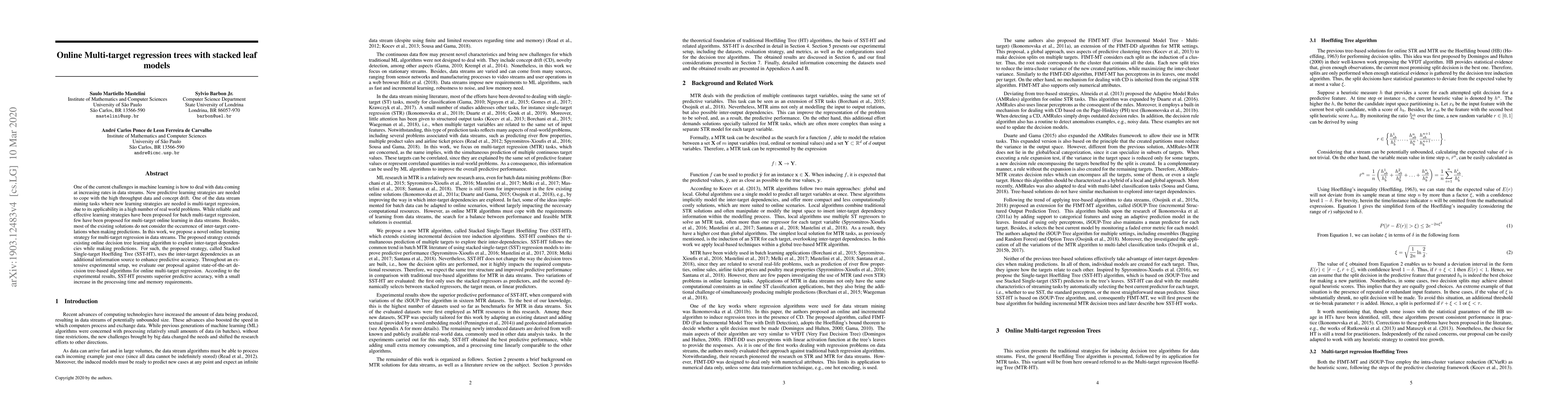 The paper proposes Stacked Single-target Hoeffding Tree (SST-HT) for online multi-target regression in data streams, extending an existing online decision tree learning algorithm to explore inter-target dependencies for enhanced predictive accuracy.