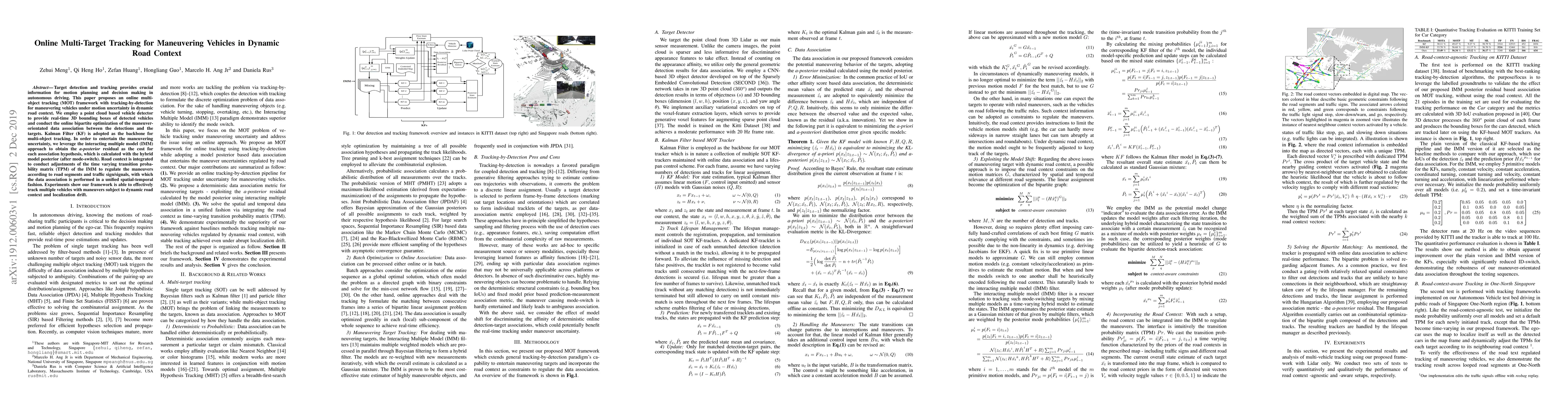 This paper proposes an online multi-object tracking framework for maneuvering vehicles using a point cloud-based detector and Kalman Filter, enhanced by an interacting multiple model approach to handle motion uncertainty. The framework integrates road context to adjust the transition probability matrix for improved data association in dynamic environments.