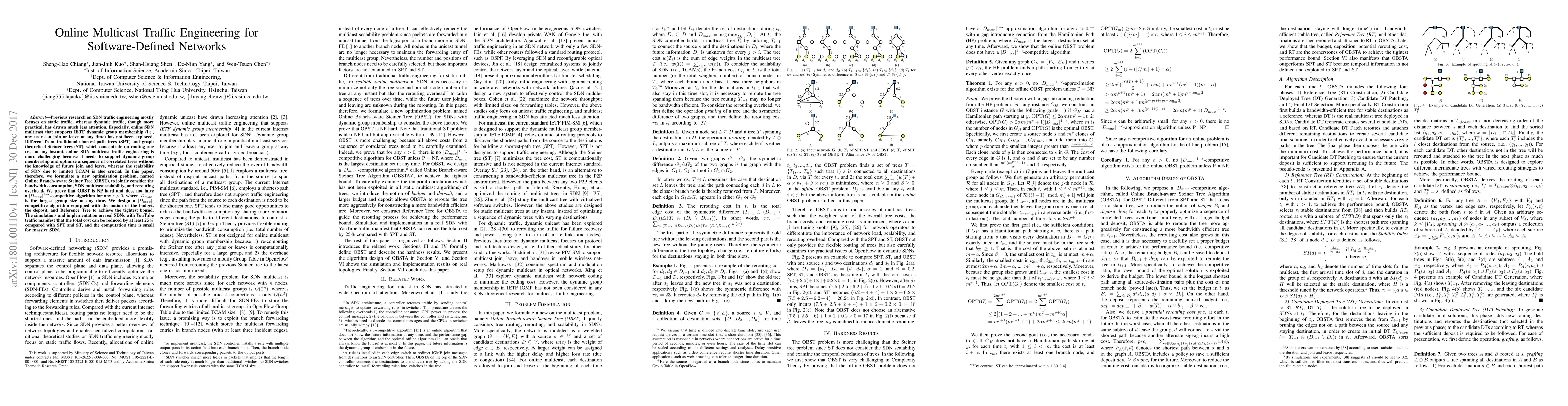 This paper introduces a new optimization problem, Online Branch-aware Steiner Tree (OBST), to address dynamic online multicast traffic engineering in Software-Defined Networks (SDN). It presents an algorithm achieving a $|D_{max}|$-competitive bound, significantly reducing total cost by at least 25% compared to traditional methods, while managing scalability and rerouting overhead.