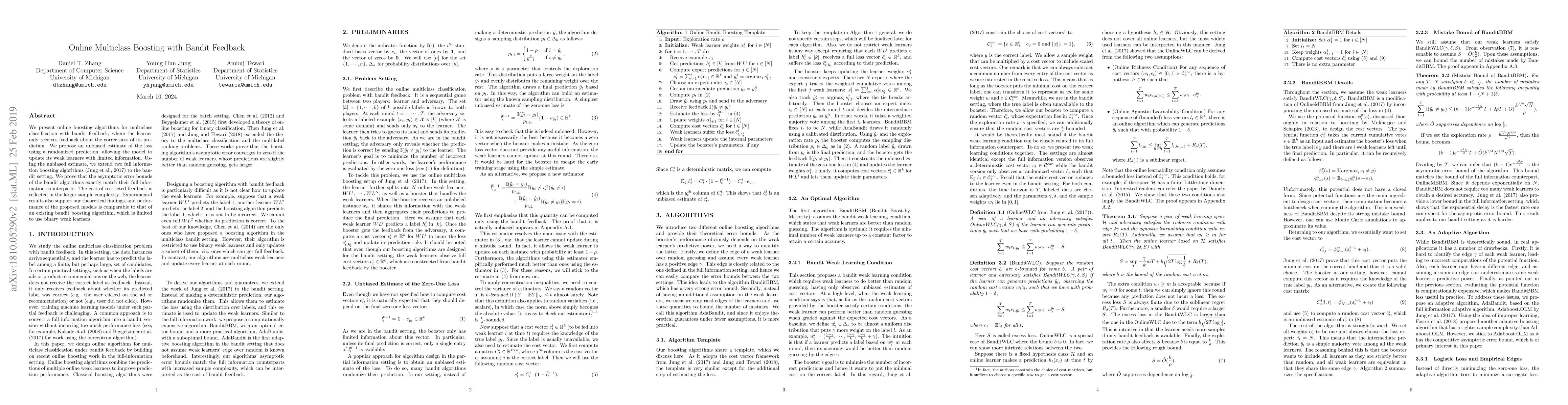 This paper introduces online boosting algorithms for multiclass classification that operate under bandit feedback, providing an unbiased loss estimate through randomized predictions. The authors extend full information boosting algorithms to the bandit setting and prove that the error bounds match those of traditional methods, though with higher sample complexity. Experimental results show competitive performance compared to existing bandit boosting models.