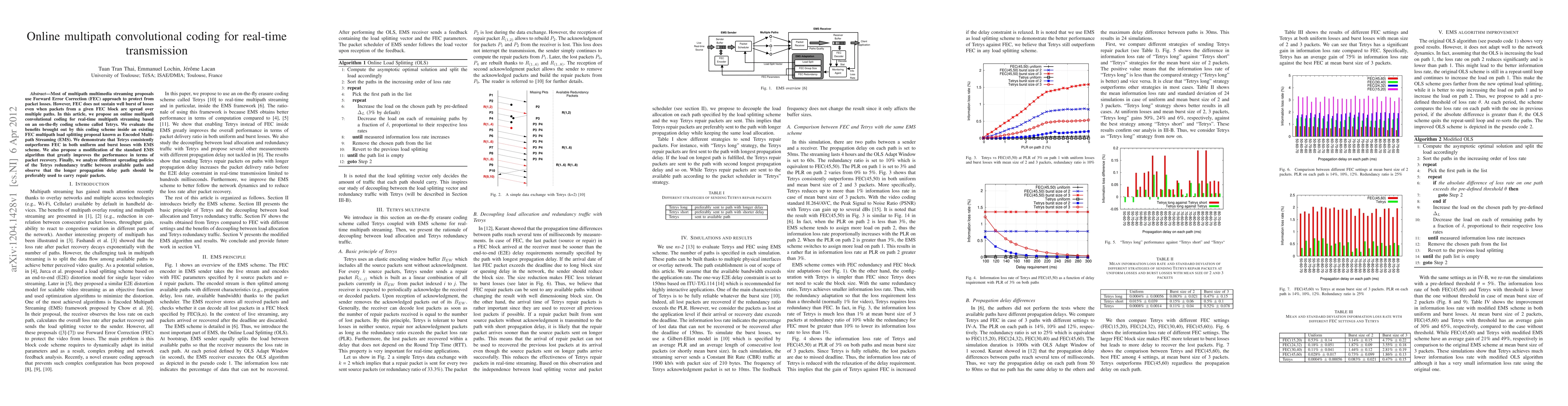 This paper proposes an online multipath convolutional coding scheme called Tetrys for real-time multipath streaming, which outperforms traditional FEC in handling both uniform and burst packet losses. The study also introduces a modified EMS algorithm to enhance packet recovery and suggests that repair packets should be sent over paths with longer propagation delays.