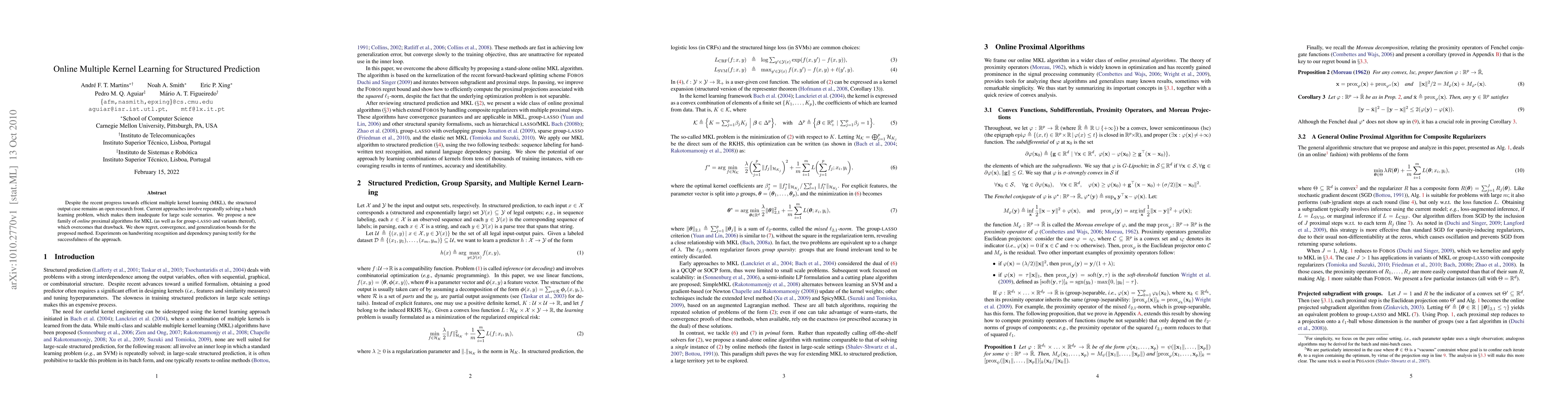 This paper proposes online proximal algorithms for efficient multiple kernel learning (MKL) in structured prediction tasks, addressing the scalability issues of traditional batch methods. The new algorithms achieve regret, convergence, and generalization bounds, and are validated through handwriting recognition and dependency parsing experiments.
