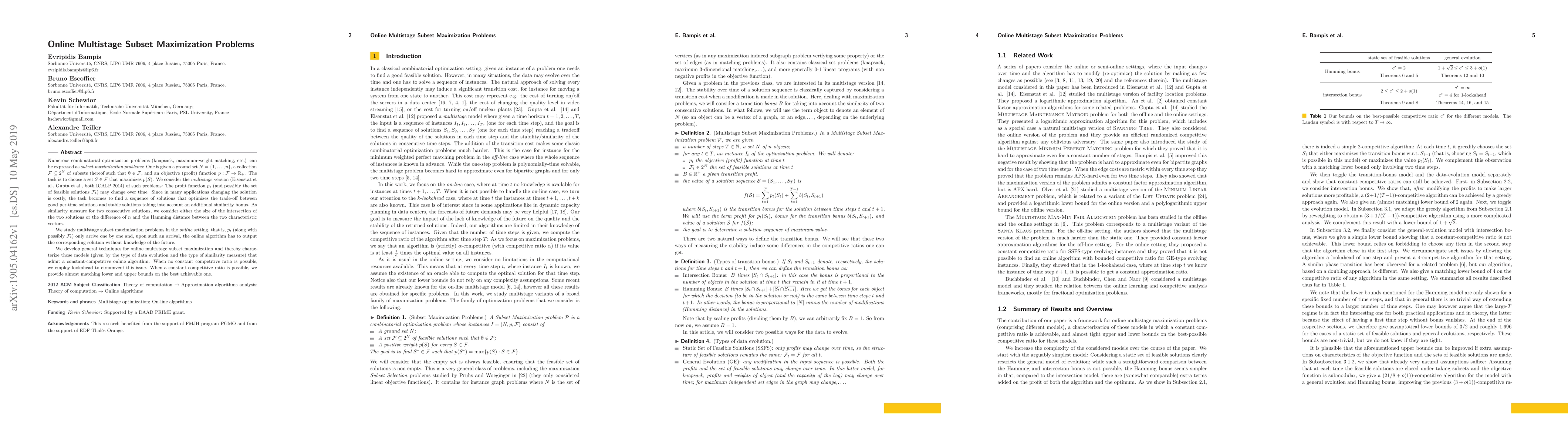 This paper studies online multistage subset maximization problems where the objective function and feasible sets evolve over time. The authors develop techniques to find sequences that balance good per-time solutions with stability, using either intersection size or Hamming distance as similarity measures. They characterize scenarios allowing constant-competitive algorithms and employ lookahead strategies when necessary.