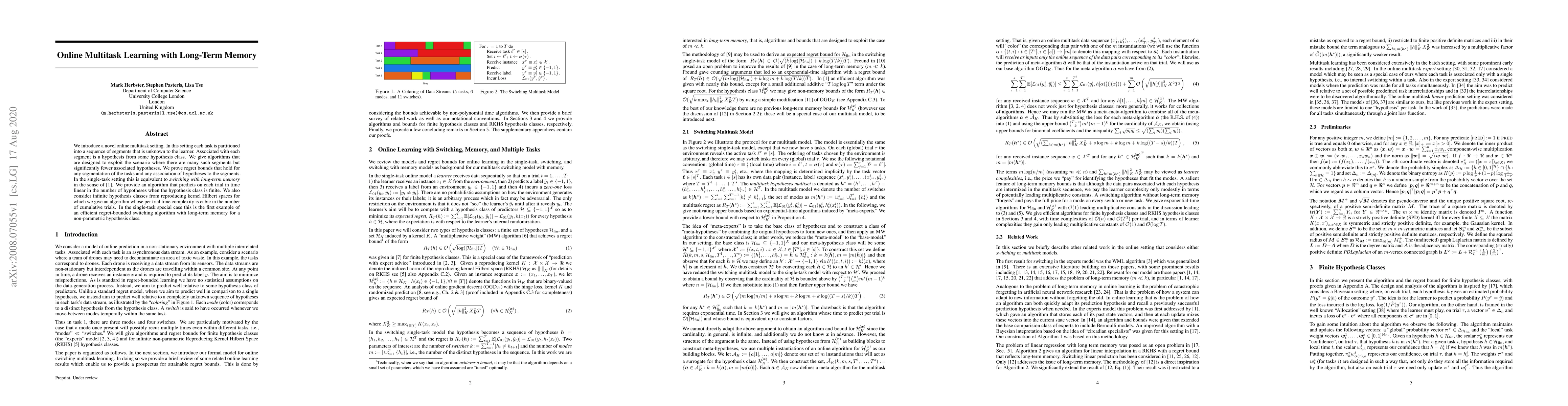 This paper introduces an online multitask learning setting with long-term memory, where tasks are partitioned into segments with associated hypotheses. It presents algorithms that achieve efficient regret bounds for both finite and infinite hypothesis classes, offering a new approach to switching with long-term memory.