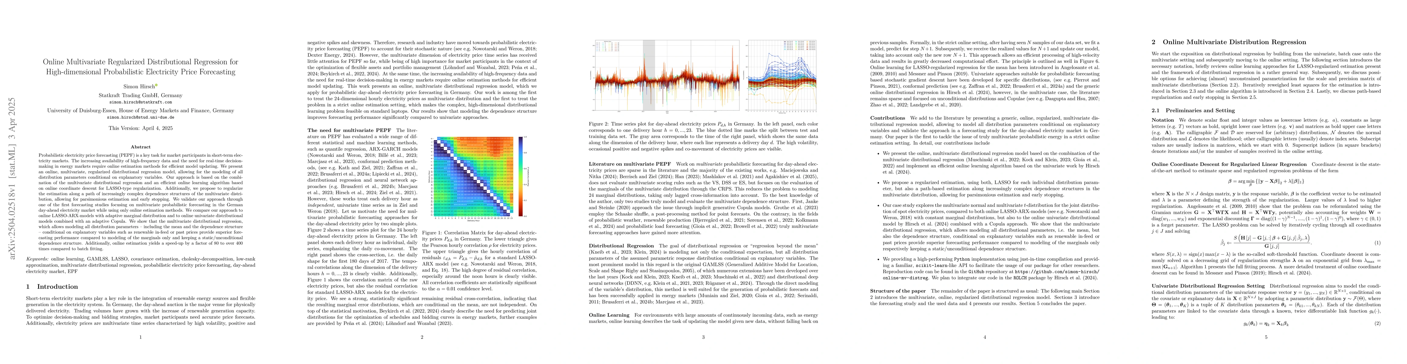 The research presents an online, multivariate, regularized distributional regression model for high-dimensional probabilistic electricity price forecasting, combining multivariate distributional regression with an online coordinate descent algorithm for LASSO-type regularization. It also proposes regularizing along a path of increasingly complex dependence structures for parsimonious estimation.