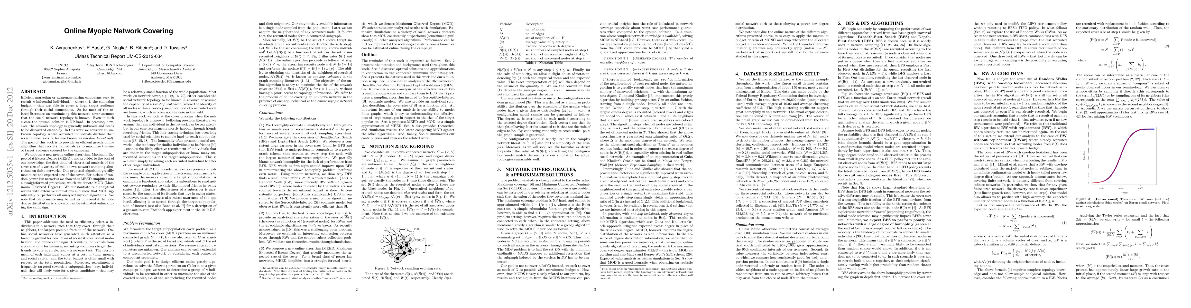 Efficient marketing or awareness-raising campaigns seek to recruit $n$ influential individuals -- where $n$ is the campaign budget -- that are able to cover a large target audience through their social connections. So far most of the related literature on maximizing this network cover assumes that the social network topology is known. Even in such a case the optimal solution is NP-hard. In practice, however, the network topology is generally unknown and needs to be discovered on-the-fly. In this work we consider an unknown topology where recruited individuals disclose their social connections (a feature known as {\em one-hop lookahead}). The goal of this work is to provide an efficient greedy online algorithm that recruits individuals as to maximize the size of target audience covered by the campaign. We propose a new greedy online algorithm, Maximum Expected $d$-Excess Degree (MEED), and provide, to the best of our knowledge, the first detailed theoretical analysis of the cover size of a variety of well known network sampling algorithms on finite networks. Our proposed algorithm greedily maximizes the expected size of the cover. For a class of random power law networks we show that MEED simplifies into a straightforward procedure, which we denote MOD (Maximum Observed Degree). We substantiate our analytical results with extensive simulations and show that MOD significantly outperforms all analyzed myopic algorithms. We note that performance may be further improved if the node degree distribution is known or can be estimated online during the campaign.