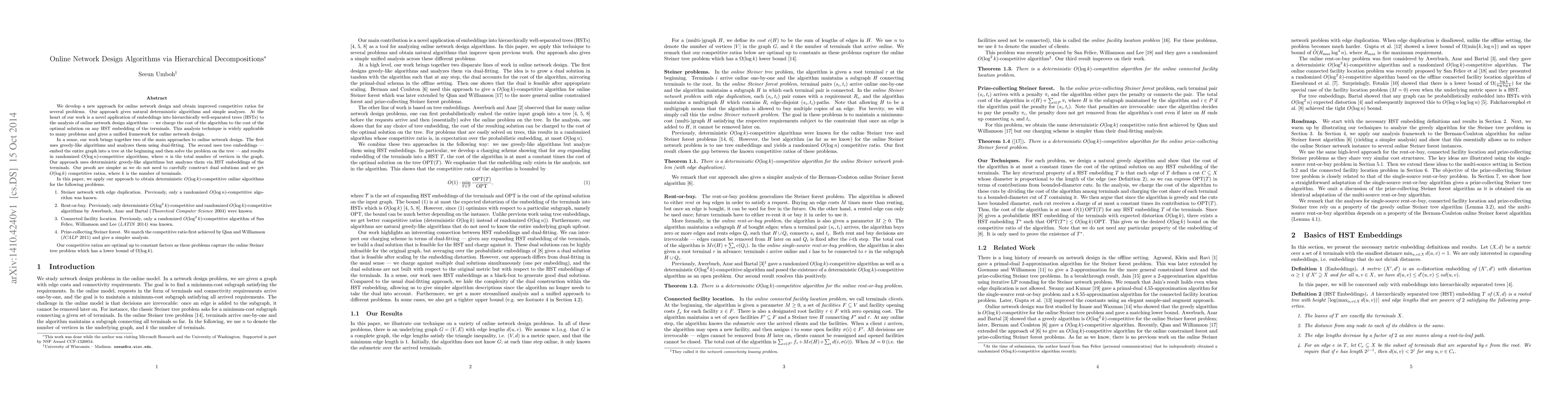 This paper introduces a novel deterministic approach for online network design using hierarchical decompositions, achieving improved competitive ratios for several problems. The method leverages embeddings into hierarchically well-separated trees (HSTs) for analysis, simplifying proofs and yielding $O(\log k)$-competitive algorithms for Steiner network with edge duplication, Rent-or-buy, Connected facility location, and Prize-collecting Steiner forest.
