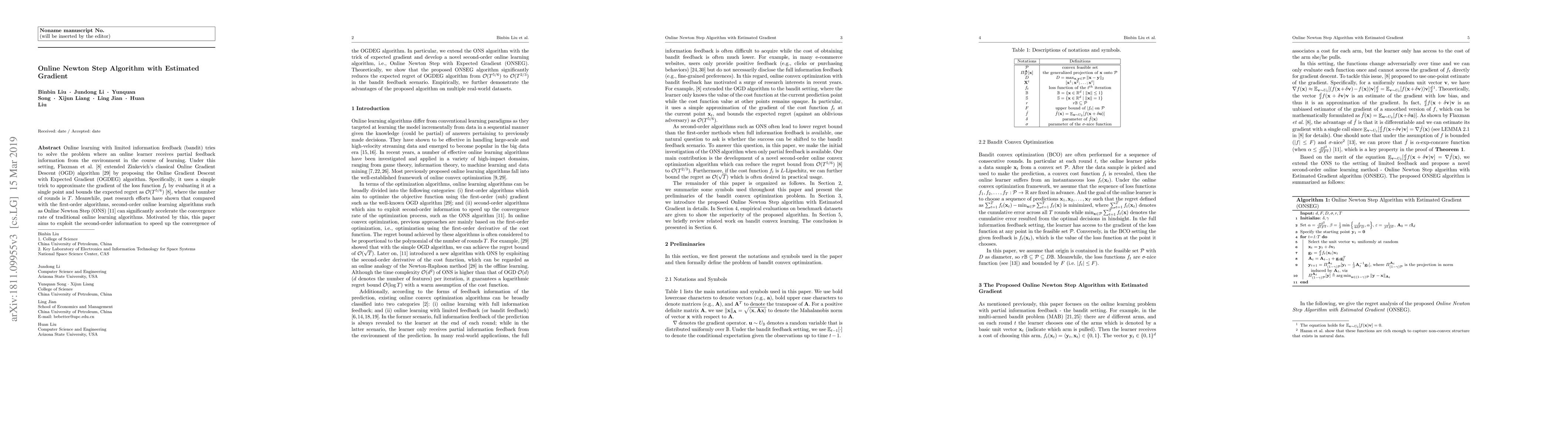 This paper proposes Online Newton Step with Expected Gradient (ONSEG), a second-order online learning algorithm that significantly accelerates convergence in bandit feedback scenarios, reducing expected regret from O(T^{5/6}) to O(T^{2/3}).