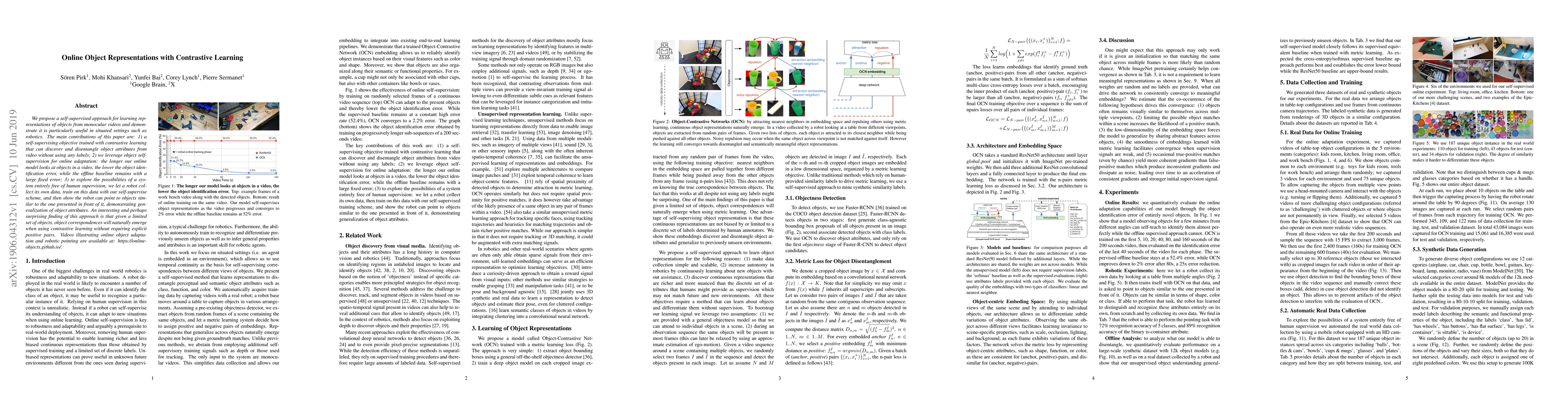 This paper presents a self-supervised method using contrastive learning to learn object representations from monocular videos, showing improved online adaptation and generalization in robotics. The approach enables a robot to collect and train on its own data, demonstrating the ability to point to similar objects without human supervision.